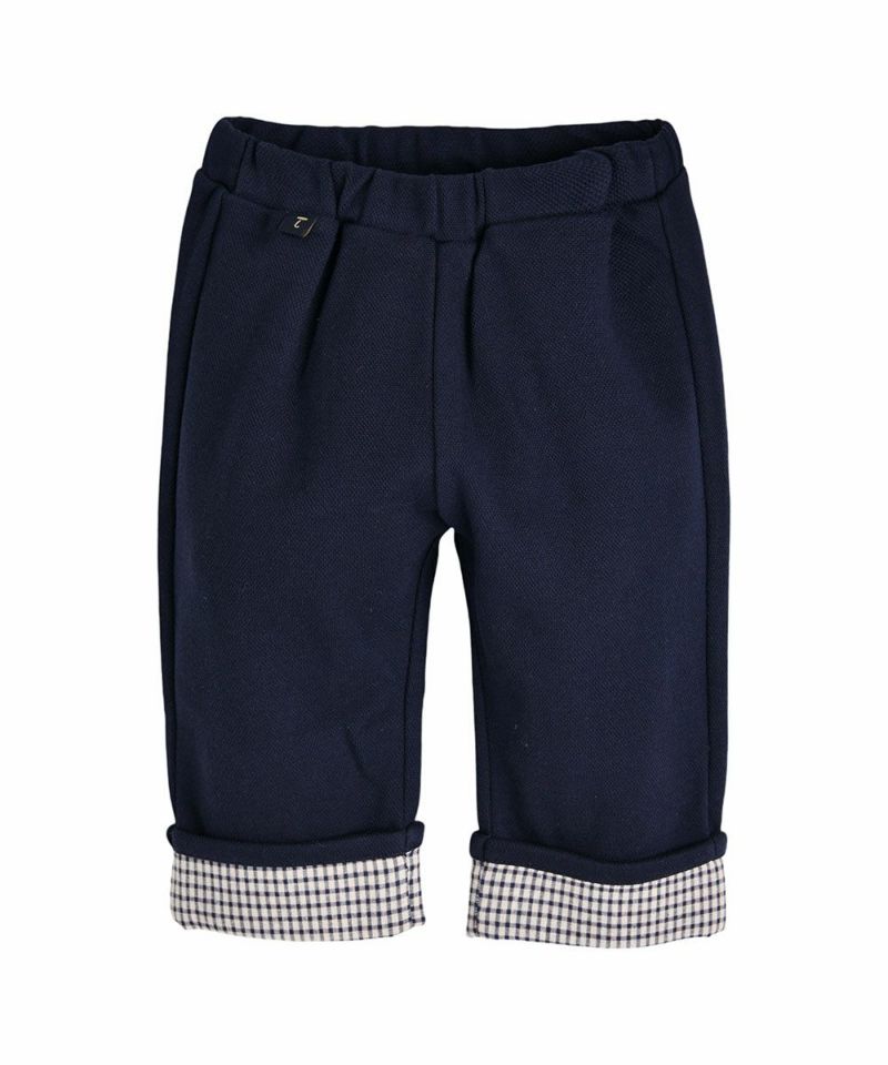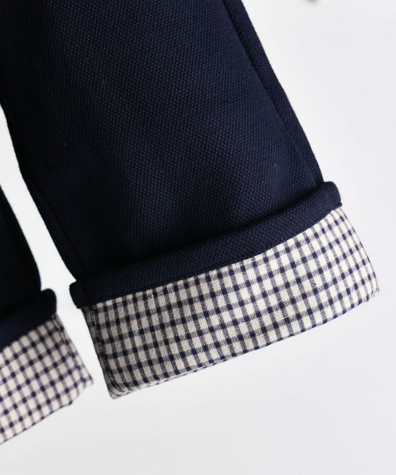 袖にニット風の素材を使用し、薄めのブラウンでカラー配色したデイリールックにぴったりなセットアップ。パンツの裾はチェック柄のウーブン地でポイントを与えたアイテムです。