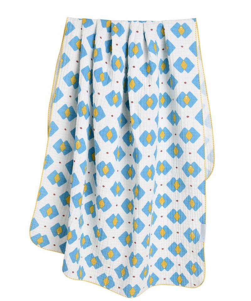 シーズンアンダーにも使われた幾何学モチーフ柄に、縁にカラーポイントを与えたブランケット。ヨールガーゼ素材を使用している為、通気性に優れ、汗のかきやすい赤ちゃんの布団代わりにも使えるヨル加工仕様。春から夏まで外出時にも手軽に使いやすい多用途アイテムです。