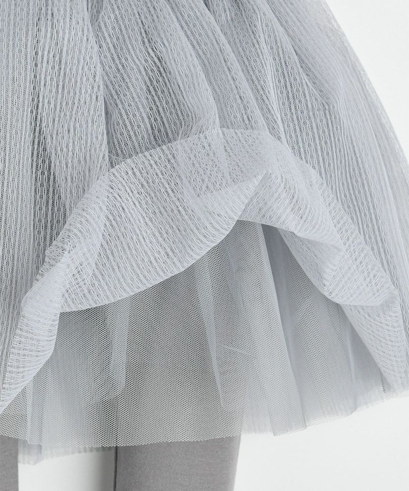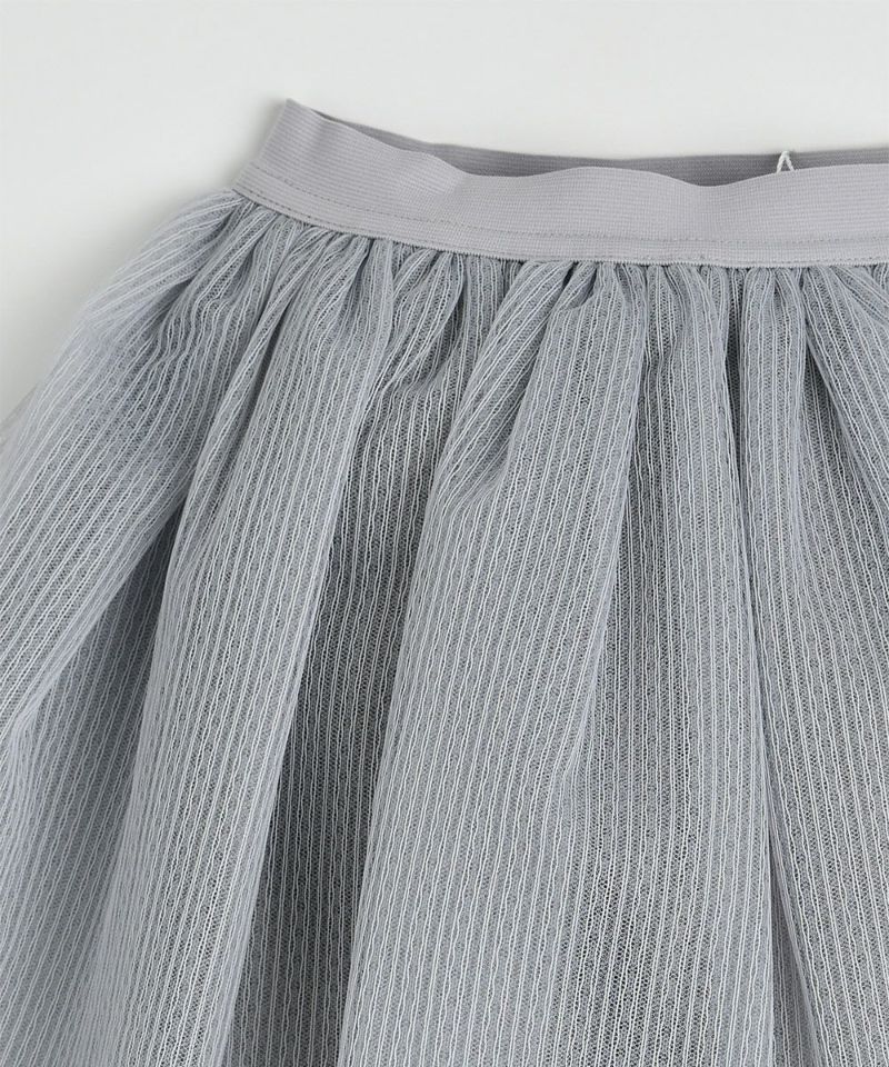 3層メッシュでふんわり感を演出したスカートタイプのレギンス。チュールのストライプパターンと膝を覆う丈感がおしゃれで雰囲気のあるアイテム。フリルカラーTシャツ(W248TSB06P)とのコーディネートがおすすめです。