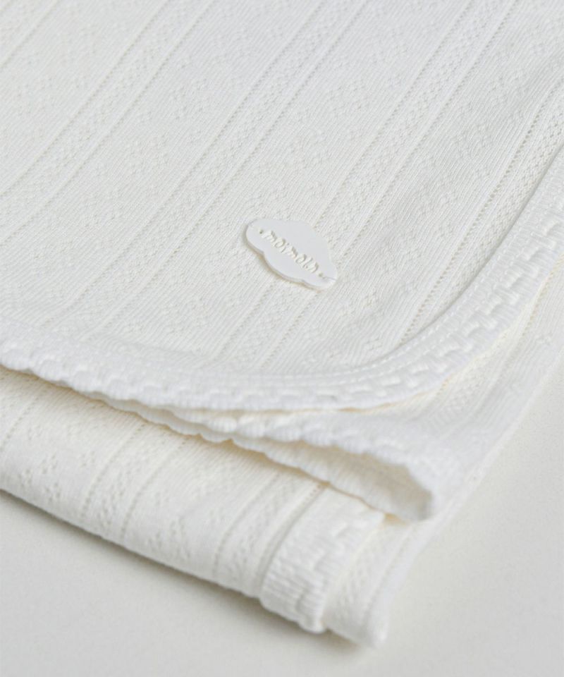 レースのような素材のおくるみ。高級感があり出産のお祝いとしても喜ばれるアイテムです。