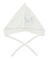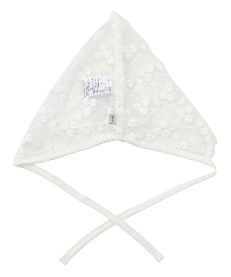 花模様のレース生地を使用したボンネット型の新生児用の帽子。