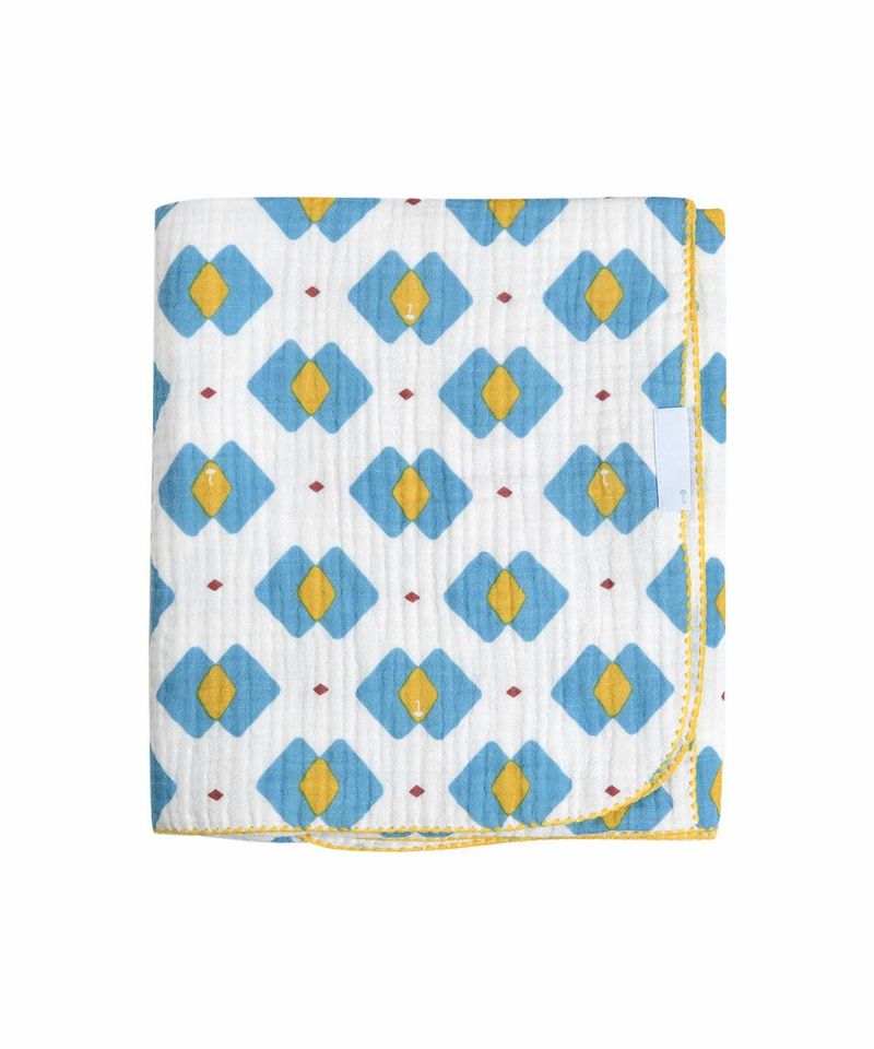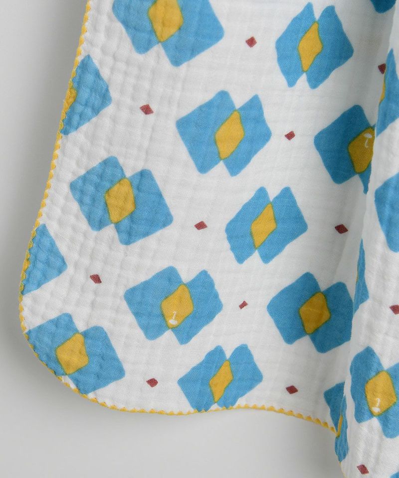 シーズンアンダーにも使われた幾何学モチーフ柄に、縁にカラーポイントを与えたブランケット。ヨールガーゼ素材を使用している為、通気性に優れ、汗のかきやすい赤ちゃんの布団代わりにも使えるヨル加工仕様。春から夏まで外出時にも手軽に使いやすい多用途アイテムです。