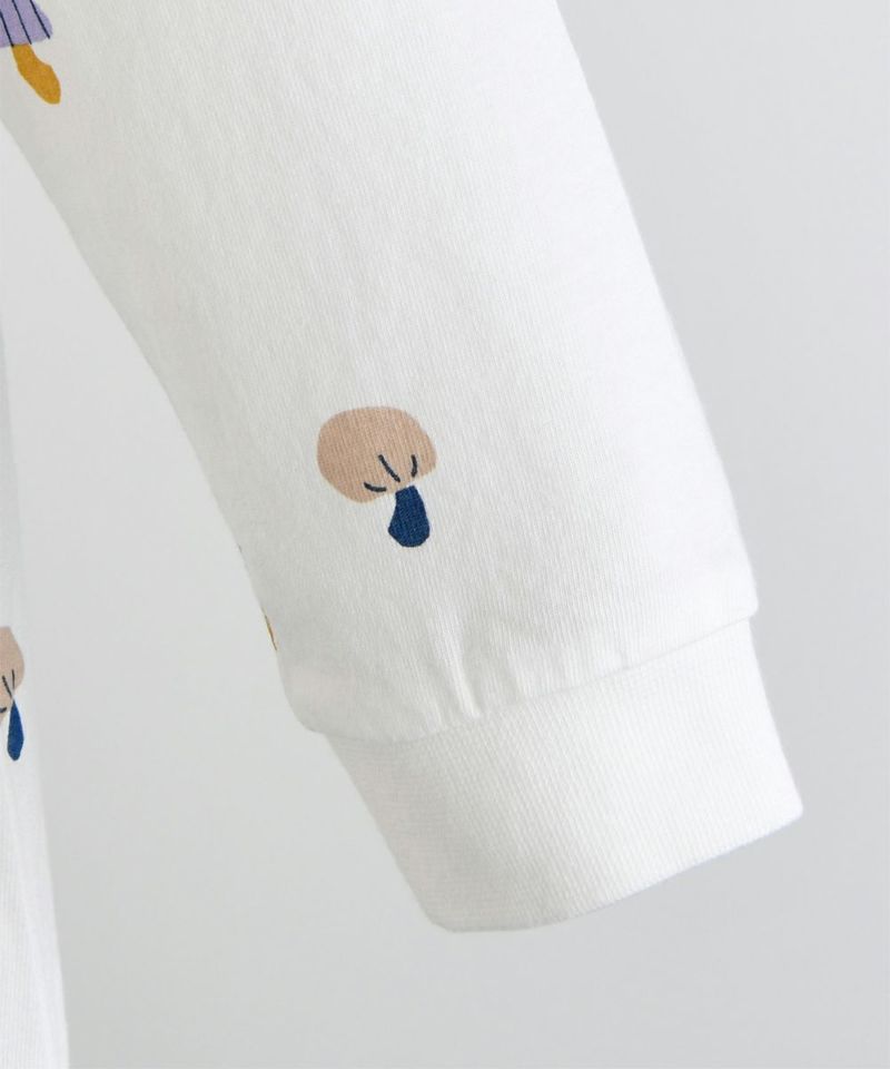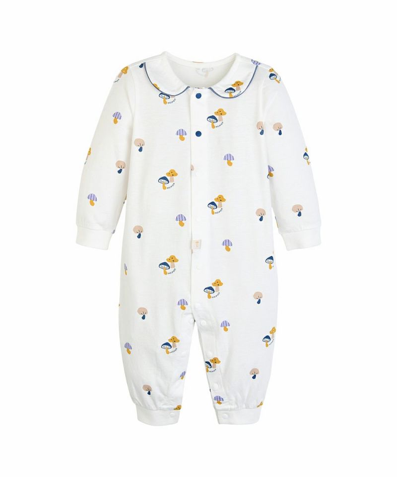襟のライン配色とカラースナップボタンでクラシックなデザインの長袖カバーオール。フロントから股部分のスナップボタンで開閉ができ、お着換えも簡単。キノコの総柄が秋らしいアイテムで、ユニセックスとして、ギフトにおすすめです。【Bamboo Fabric】バンブー素材は抗菌・消臭効果があり、水や汗を素早く吸収・発散し通気性が高い素材です。清涼感もあり保湿にも優れたお肌に優しい柔らかい素材です。