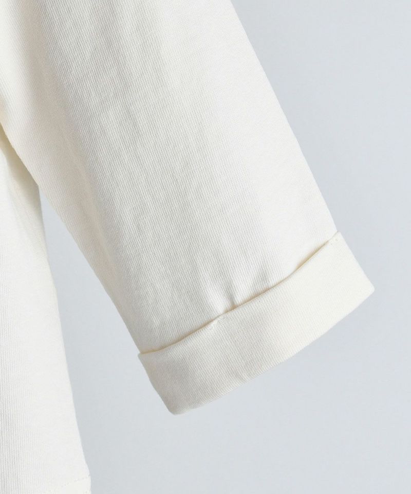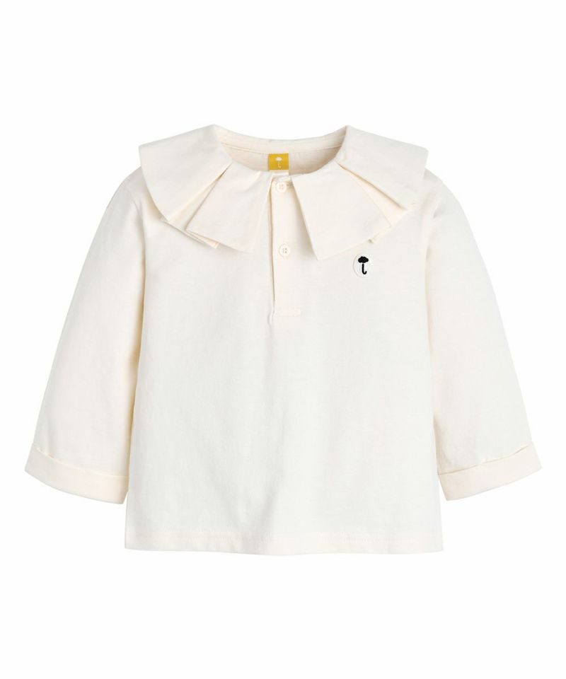 プリーツの大きな襟がポイントのTシャツ。ノーカラーアウターとの組み合わせがおすすめです。