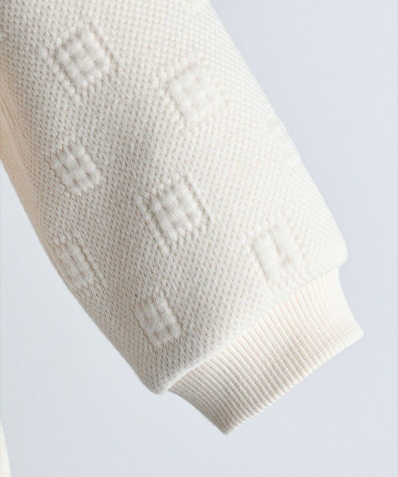 エンボス加工されたクッキーモチーフの素材とキレイになじんでいるゴムワッペンがポイントのトレーナー。シンプルに一枚着る単独コーディネートだけでなく、マルチコーディネートが可能なアイテムです。