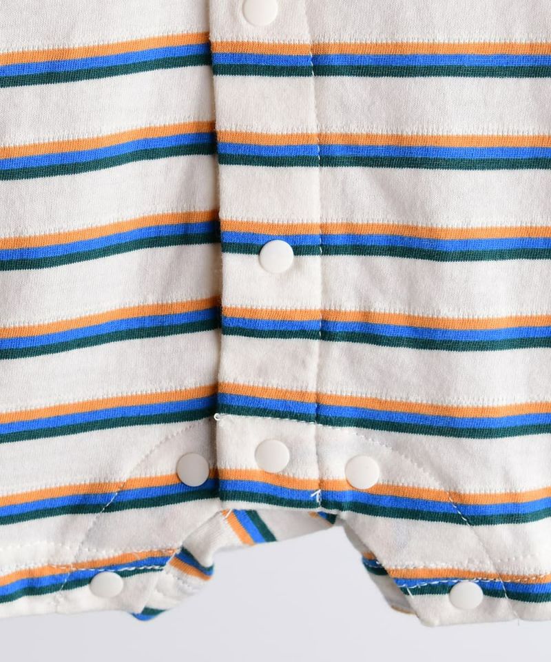 カラーフルなボーダーの4分丈のカバーオール。襟のバイカラーと水爆弾のワッペンがポイントになります。