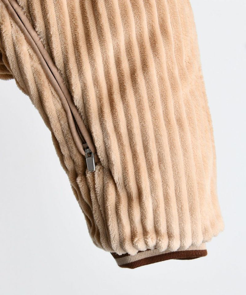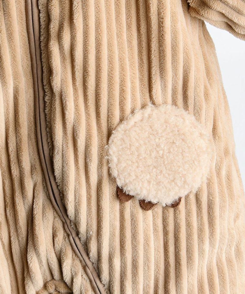 ふんわりとしたファーのリブ素材にボア裏地を使用し、保温性を高めたクマのカバーオール。大きなくま耳とおしり部分、フロントポケットにポイントを与えたアイテム。フロントポケットのコーデュロイ素材のくまの爪がこだわりポイントです。