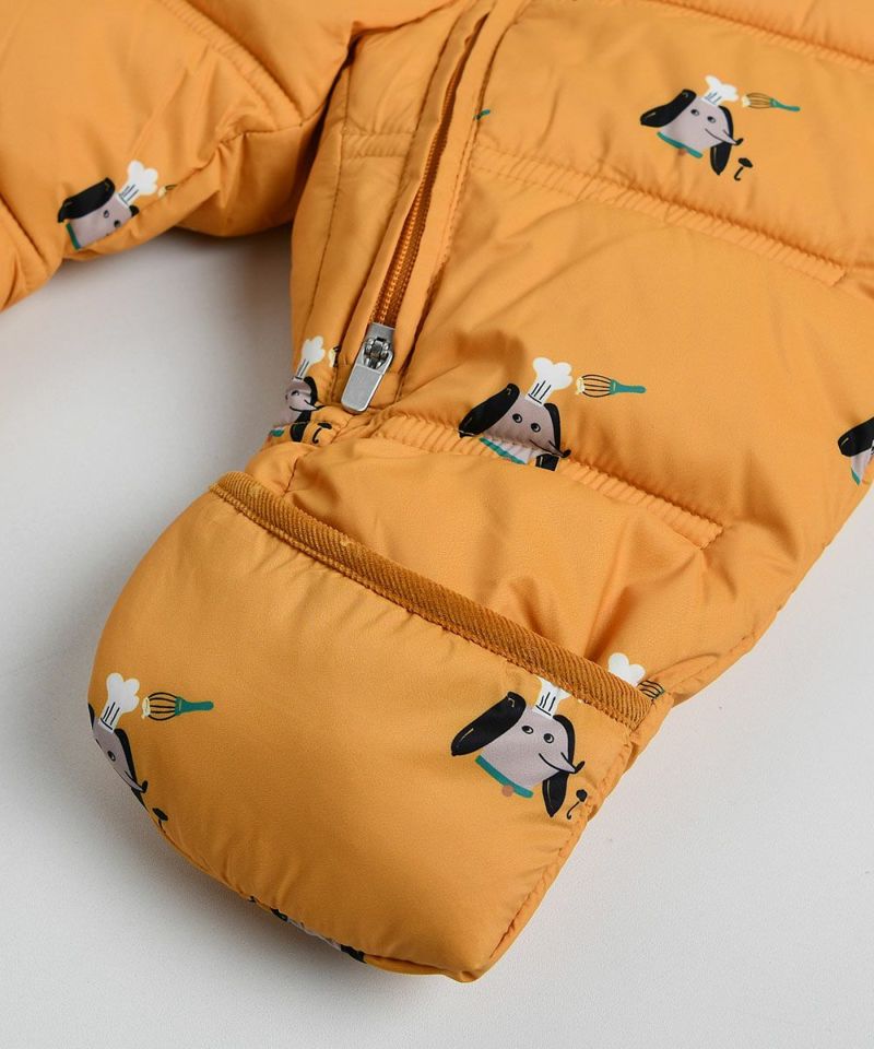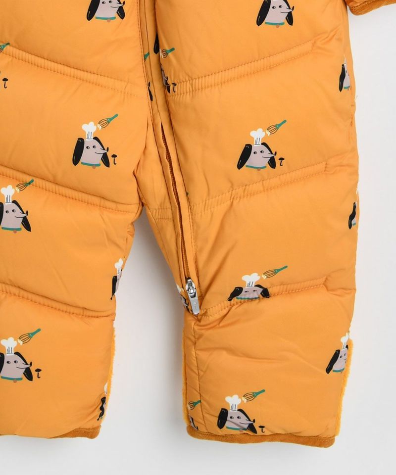 環境を考えたリサイクル素材とパンを焼いている犬のモチーフの総柄がポイントのカバーオール。黒い犬の耳がこだわりポイントです。