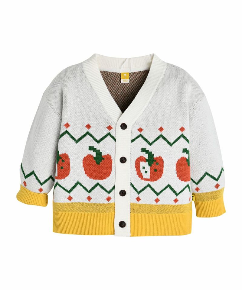 ピーマンのグラフィックがユニークなカーディガン。アクリル素材を使用し、やわらかいタッチ感に。一枚羽織るだけでおしゃれになるアイテムです。