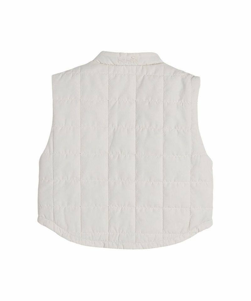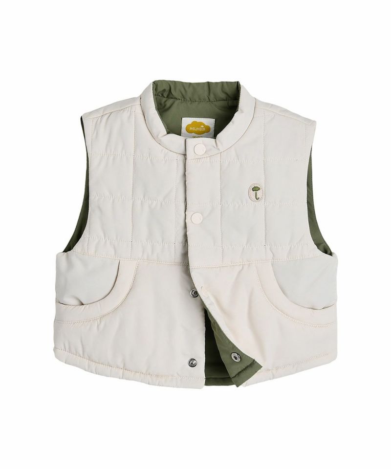季節の変わり目に活躍する軽いベスト。四角いキルティングの切り替わりがポイント。ポケット口の丸いデザインが、かわいらしさを演出してくれるアイテムです。