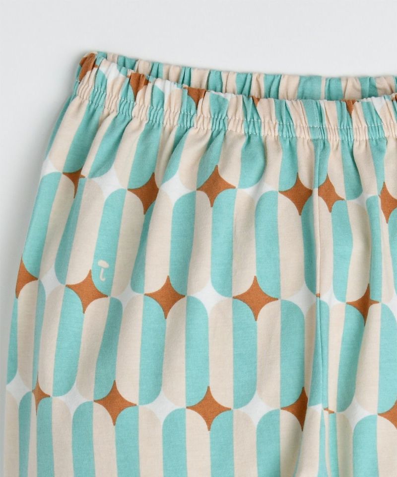 幾何学モチーフのプリントモダールコットンパジャマです。肌触りもよく、ストレッチ性があり動きやすいアイテムです。