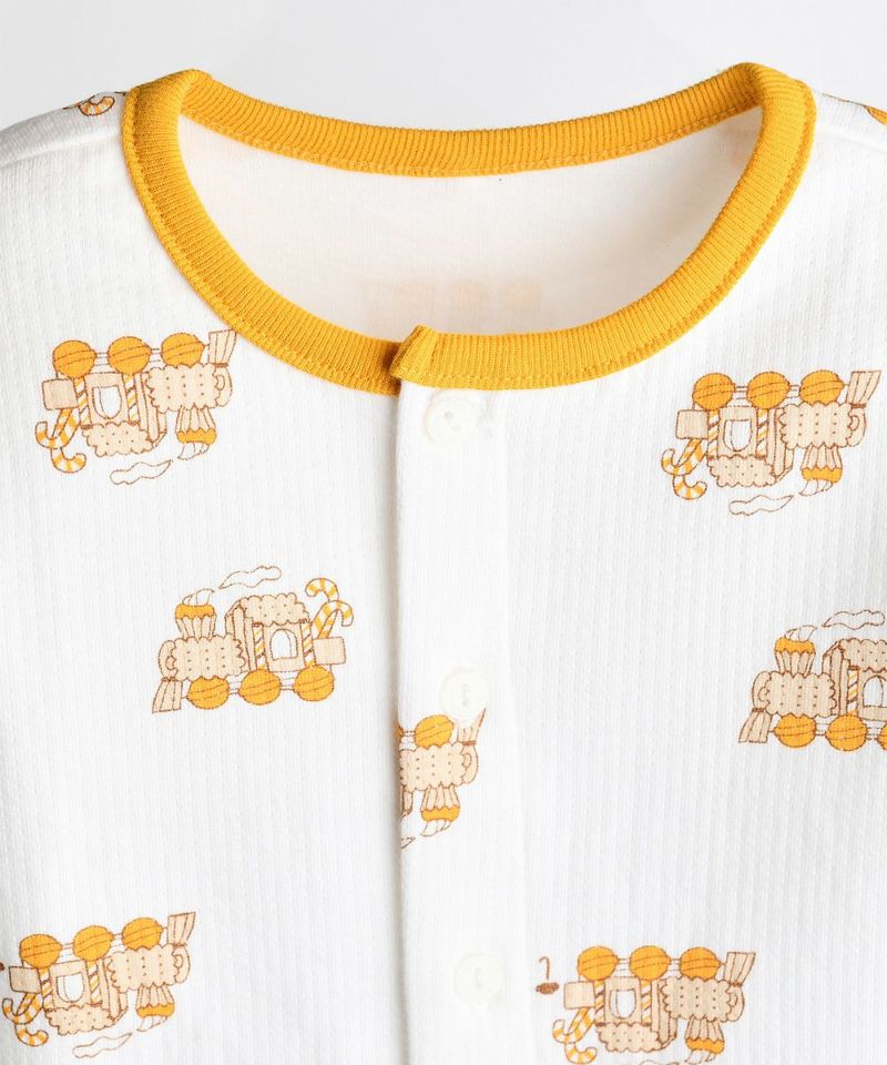 クッキーの汽車のグラフィックがデザインされたルームウェア。首元のカラー配色がポイントのアイテムです。