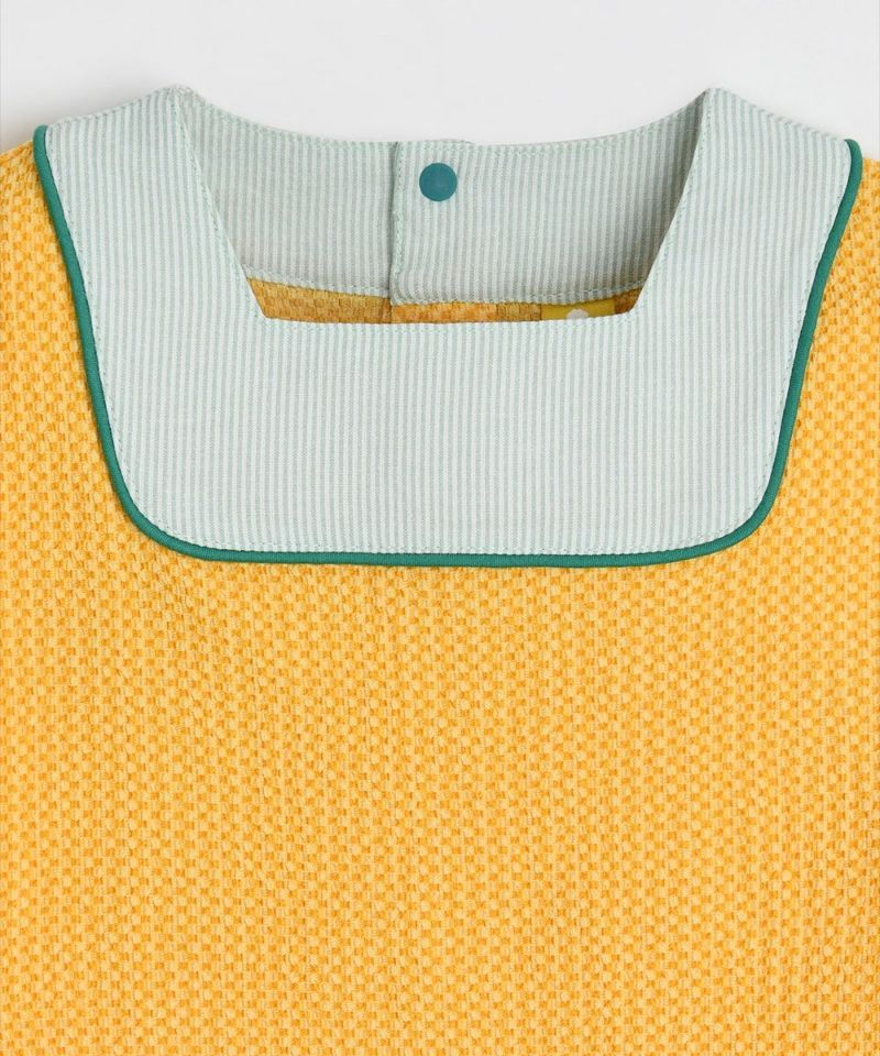 かわいいイエローとさわやかなグリーンカラーがポイントのセットアップ。トップスは4分丈袖で、ボトムは7分丈となっており、大きい刺繍がユニークなアイテムです。
