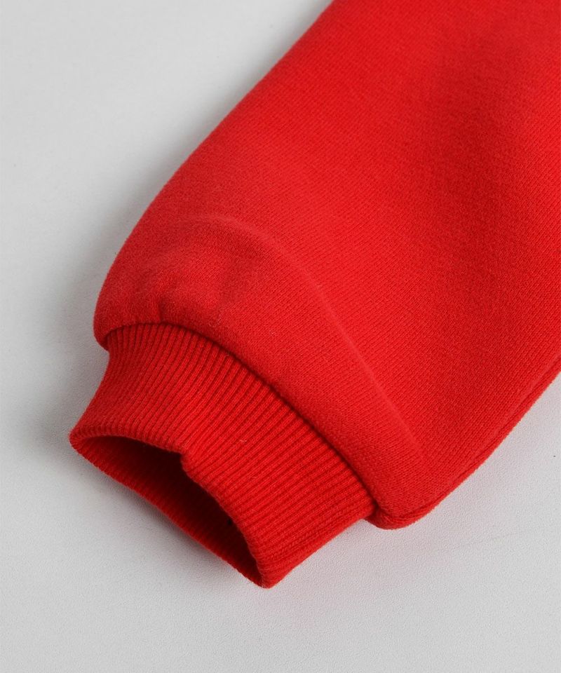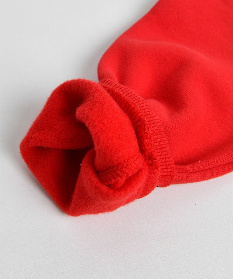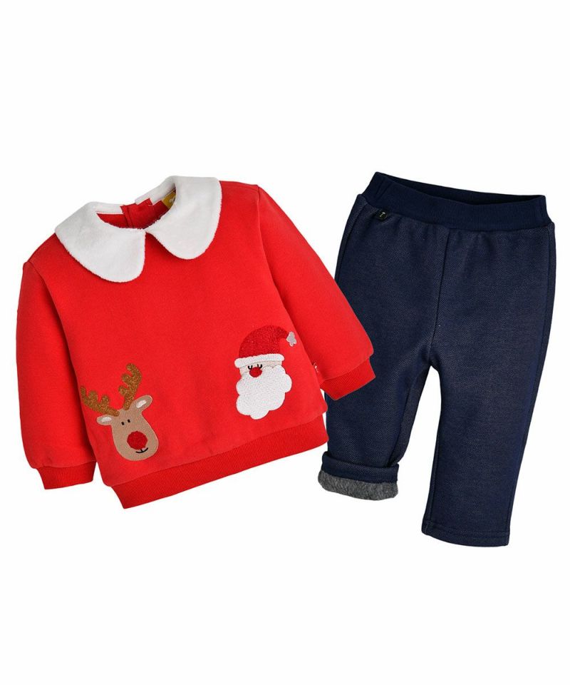 おなかのトナカイとサンタの刺繍がポイントの起毛トレーナーと伸縮性のあるデニム風のパンツがセットで構成されたセットアップ。クリスマスプレゼント用にぴったりなアイテムです。