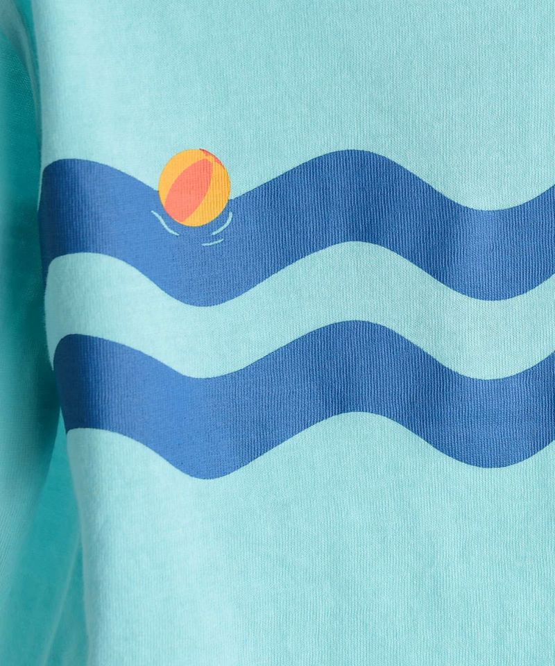 さわやかな色味の9分丈Tシャツ。胸もとのウェーブプリントがポイントになり、アニマルたちのグラフィックが可愛いポイント。通園ルックにもおすすめです。