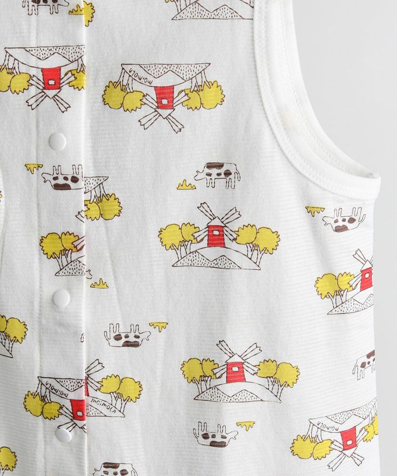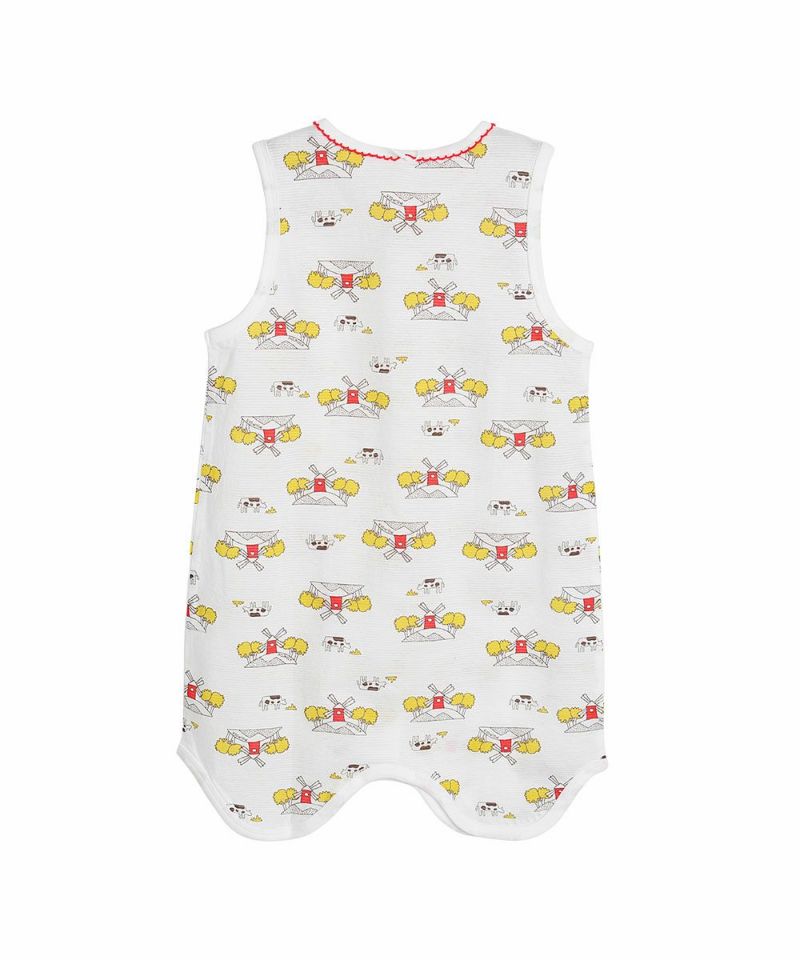 風車が回る農場の柄と明るいレッドカラーのネックピコレースで女の子らしいポイントを与えたスリーパーです。