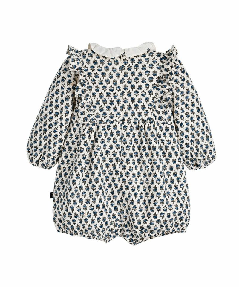 襟のブルーパイピングデザインがポイントのフラワープリントカバーオールセット。胸元の刺繍もポイントの一つです。
