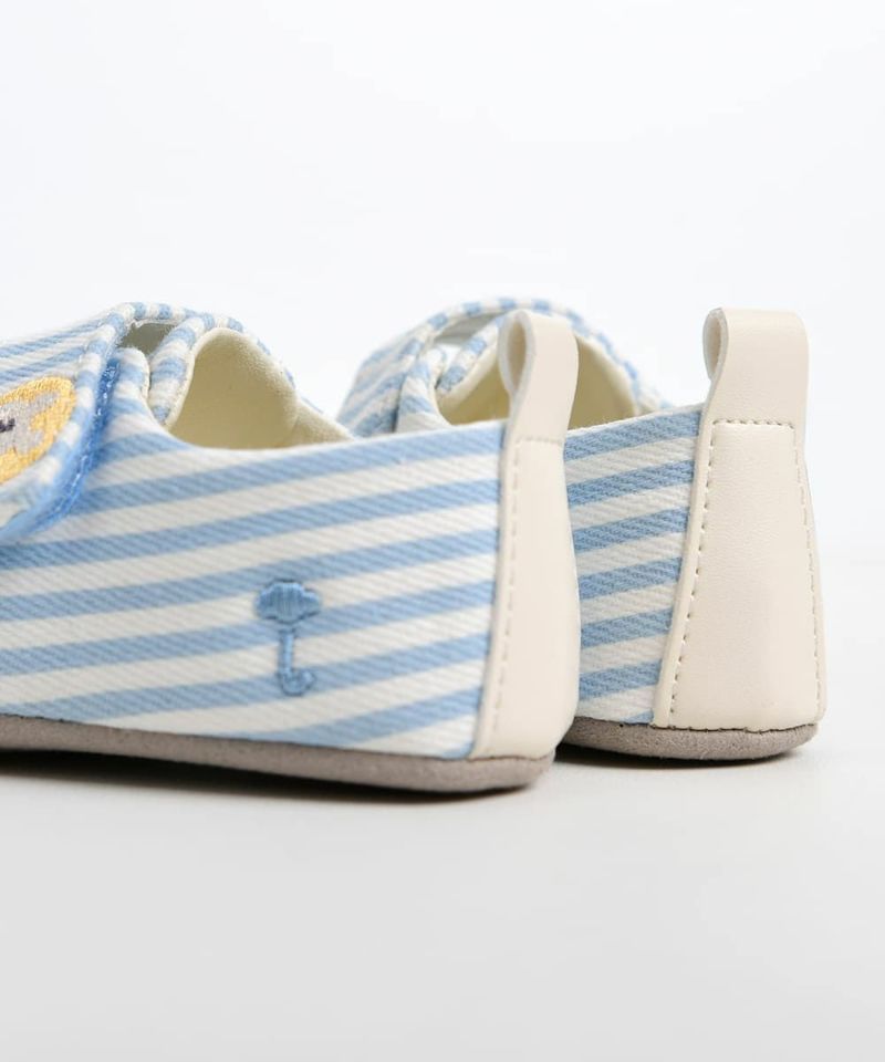 スカイブルーのストライプがさわやかなベビーシューズ。バルーンのベア刺繍がポイントです。