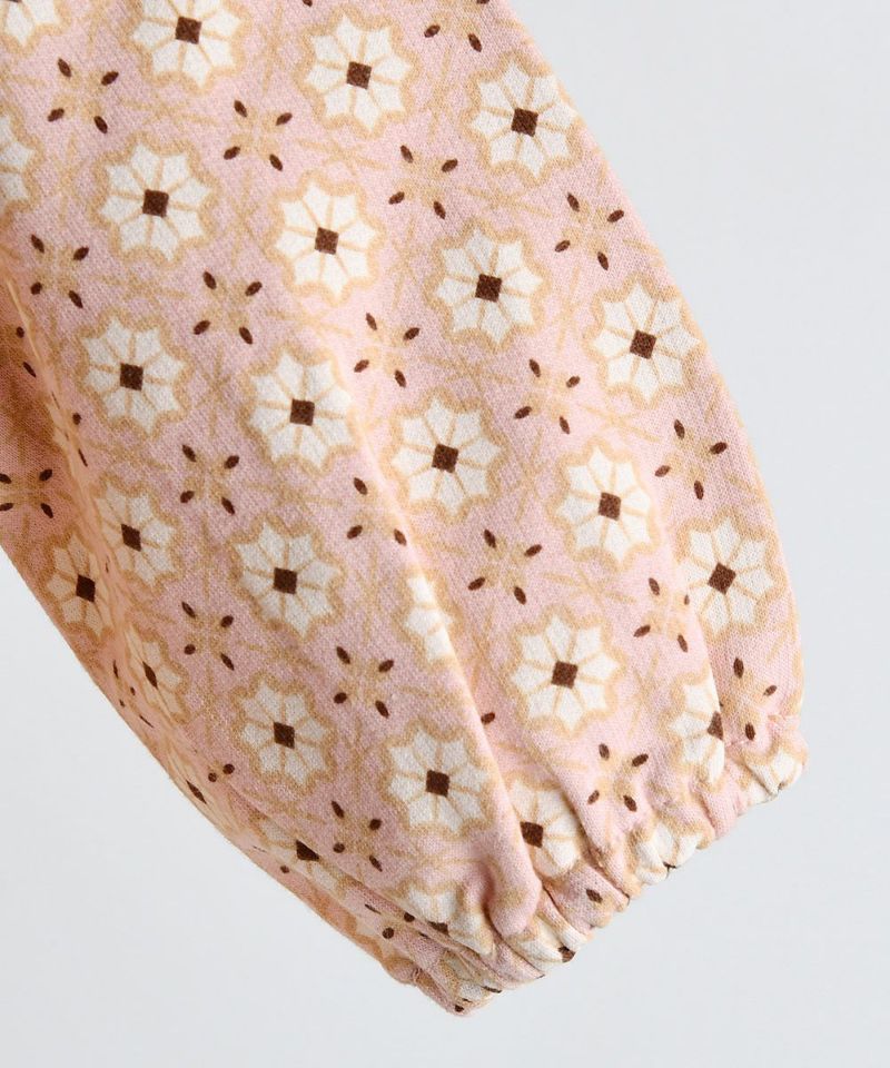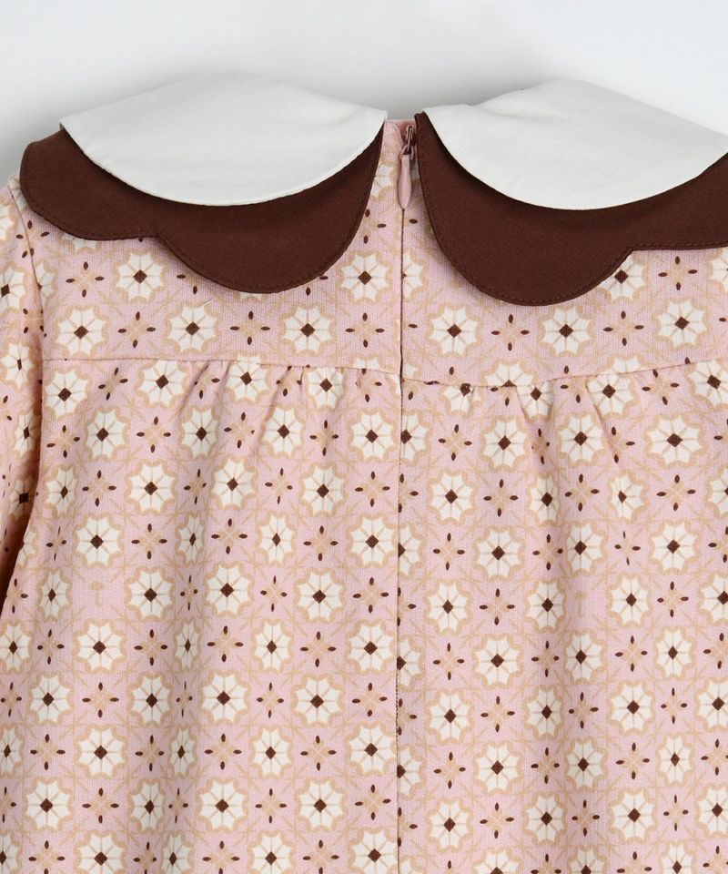 幾何学パターンのワンピース。トーンダウンしたピンクカラーにブラウンカラーの襟が大人っぽく、二重襟がポイントのアイテムです。