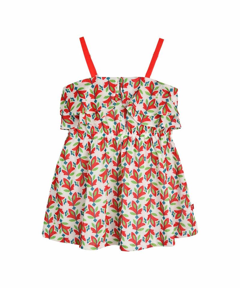 クールな冷感素材を使用した肩紐キャミソールワンピース。肩紐には調節リングがあり紐の長さを調節することが可能で、華やかなカラー感のプリントがフリルディテールと調和してバカンスルックとして活用できるアイテムです。