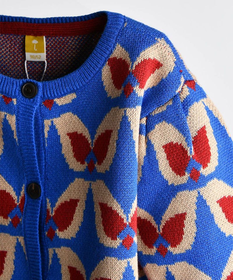 レトロ風の幾何学モチーフニットカーディガン。ボリューム感のある方のシャーリングが女の子らしさをアップしてくれるアイテムです。