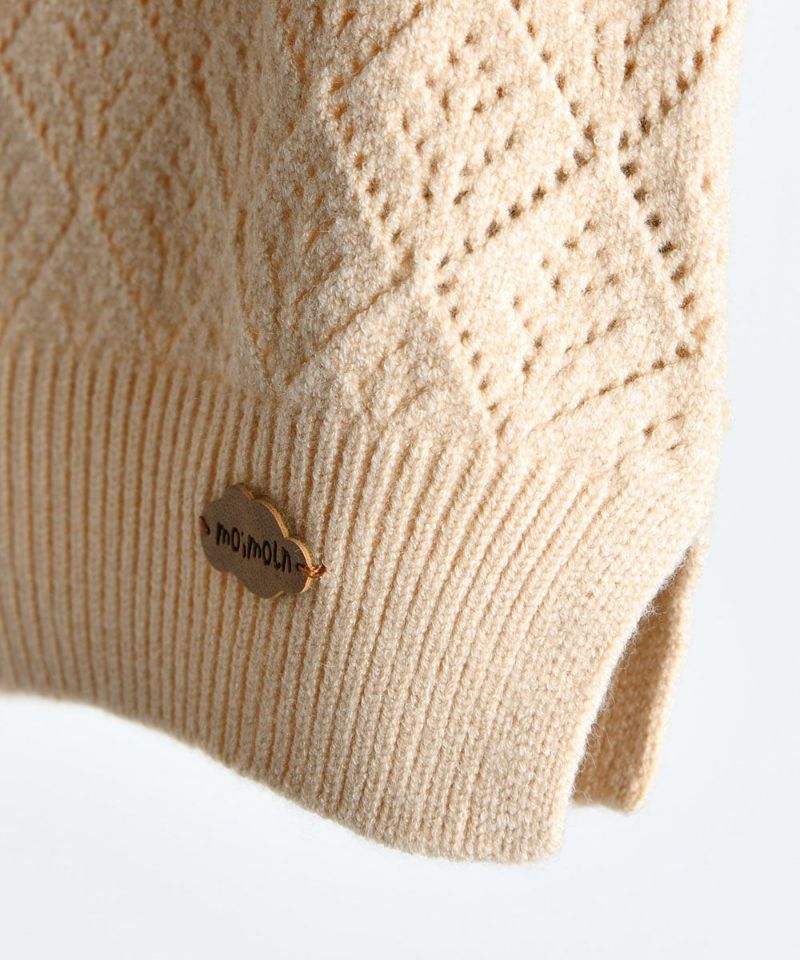 柔らかいタッチ感の暖かいニットベスト。ダイヤ型の編み込みやネックと袖口がかわいさを演出してくれるアイテム。様々なワンピースとマルチコーディネートが楽しめます。