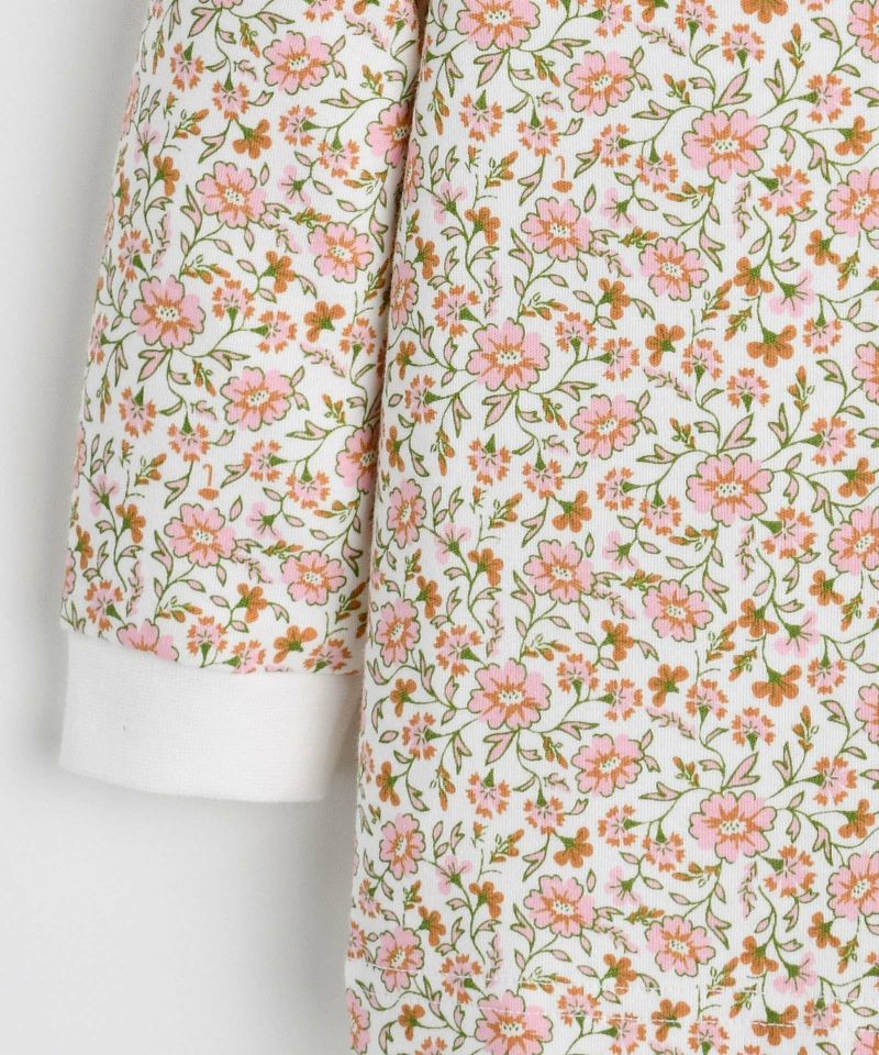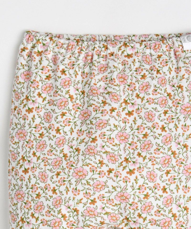 花柄にネック部分のフリルとオフホワイトカラーが女の子らしい印象を与えるルームウェアです。