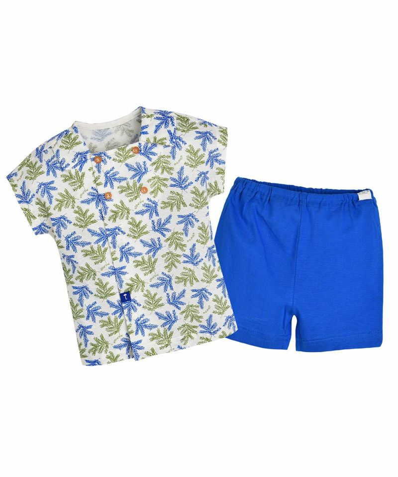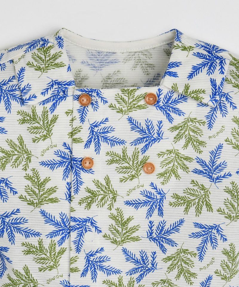 トロピカルムードのリーフ前面の柄にスクエアネックラインとダブルボタンポイントを加えブルーカラーパンツをマッチングした半袖ルームウェア。シダーリーフロンパース(W242BUN20P),(W242NNN49P)と兄弟ルック、兄妹ルックがおすすめです。