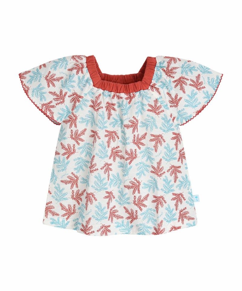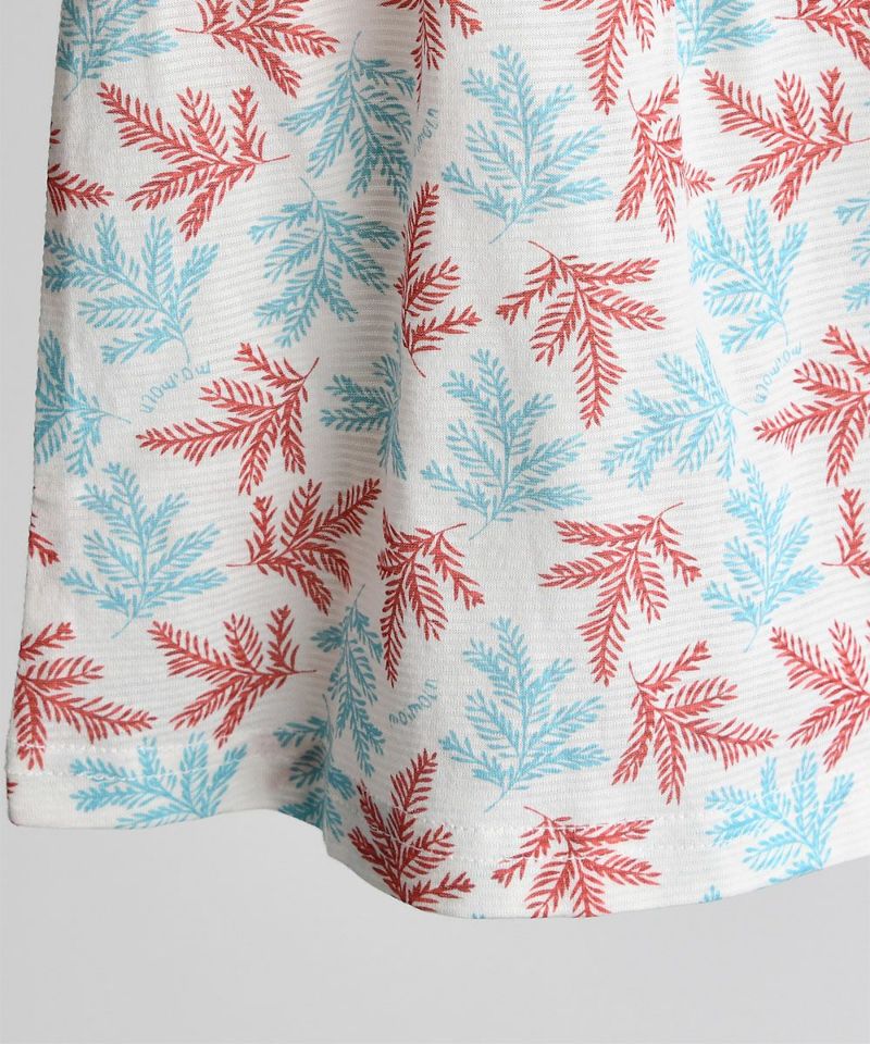 トロピカルムードのリーフ柄とスクエアゴム仕様のネックライン、袖先のバーガンディーカラーがポイントの半袖ルームウェア。シダーリーフロンパース(W242BUN20P),シダーリーフ前ボタントップス&パンツ(W242NNN47P)と兄妹ルックがおすすめです。