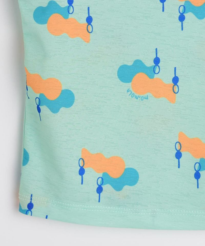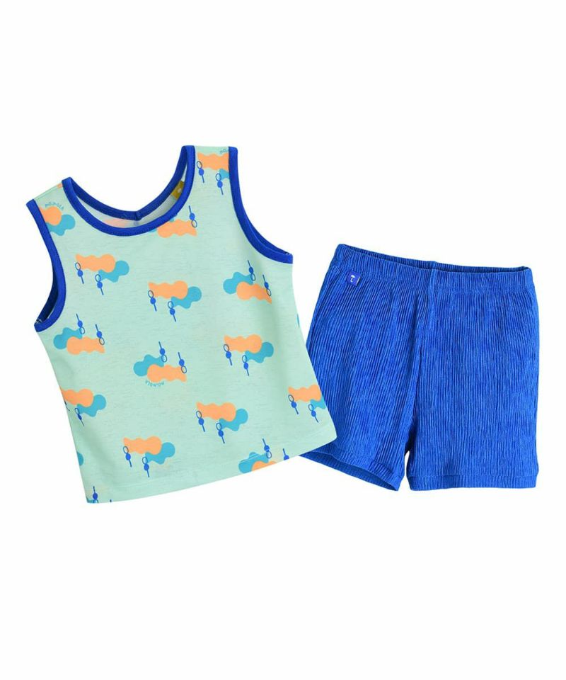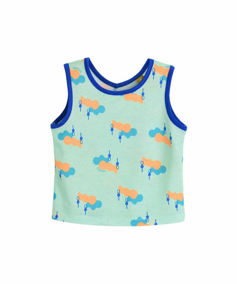 涼しいクール素材を使ったノースリーブセットアップ。カジュアルな色味のプリントがポイントで、楽で動きやすいシルエットのアイテムです。