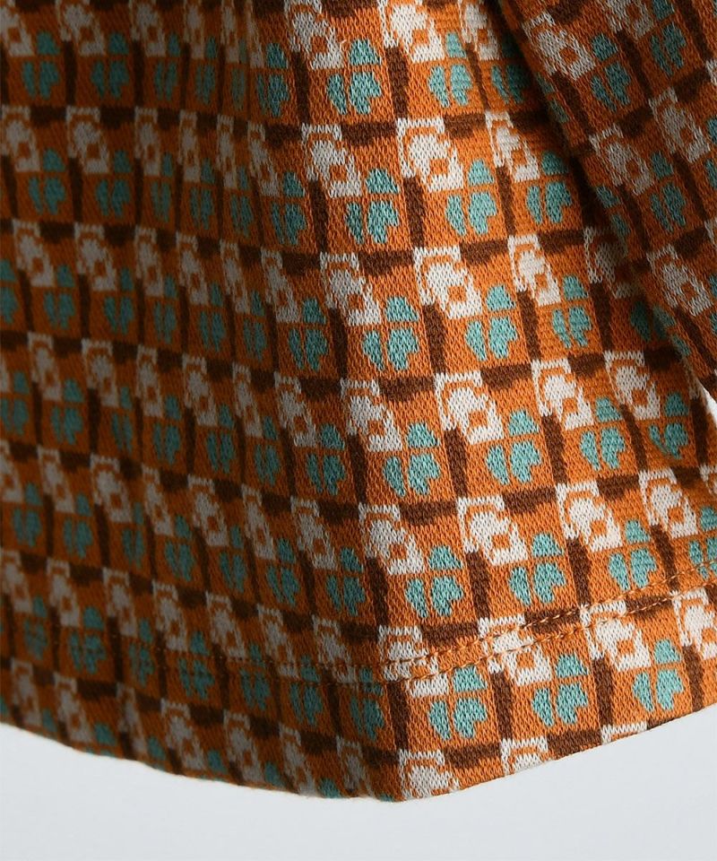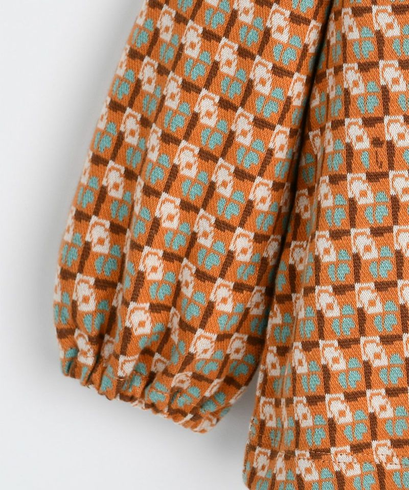 ジャカードパターンセットアップ。Aラインシルエットのトップスに丸い形の襟と刺繍がポイントで、季節の変わり目から着用しやすいアイテム。ハートスクエアワンピー(M244OPB55P)と姉妹ルックがおすすめです。