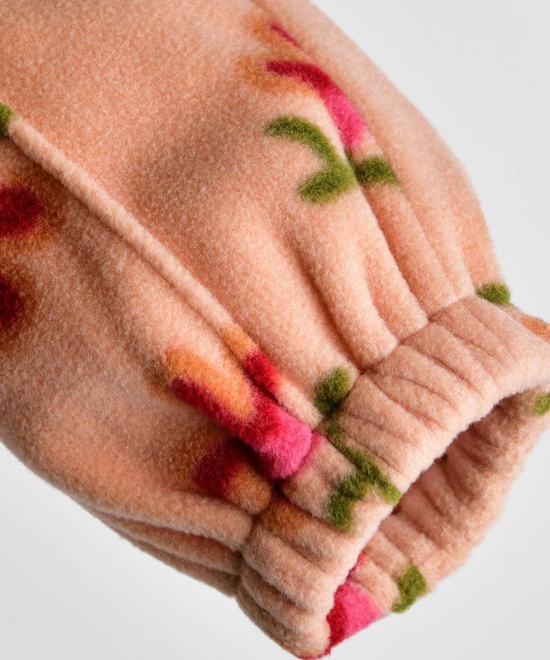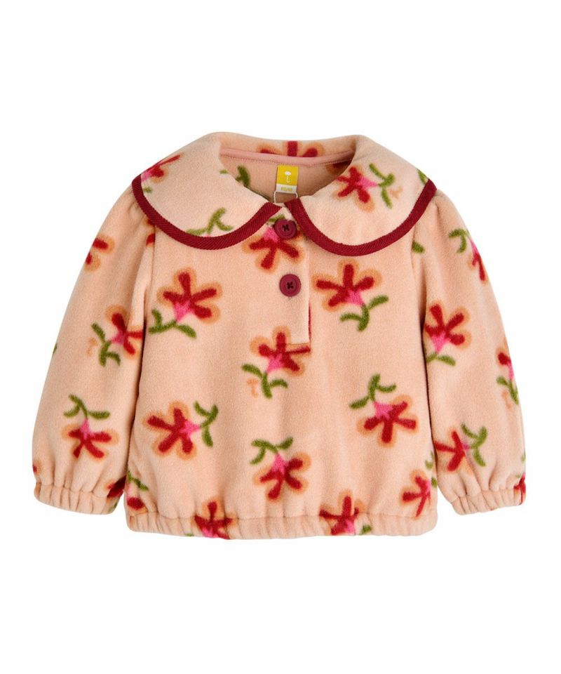 保温性に優れたソフトなフリース素材の花柄セットアップ。大きな襟の淵にはコーデュロイ素材の配色、バーガンディーボタンを使用するなど細かい部分にもこだわり要素が満載で、通園コーデにも使えるアイテムです。