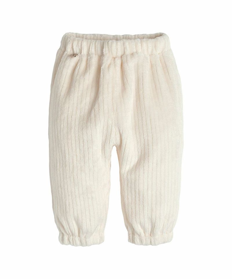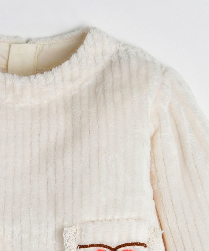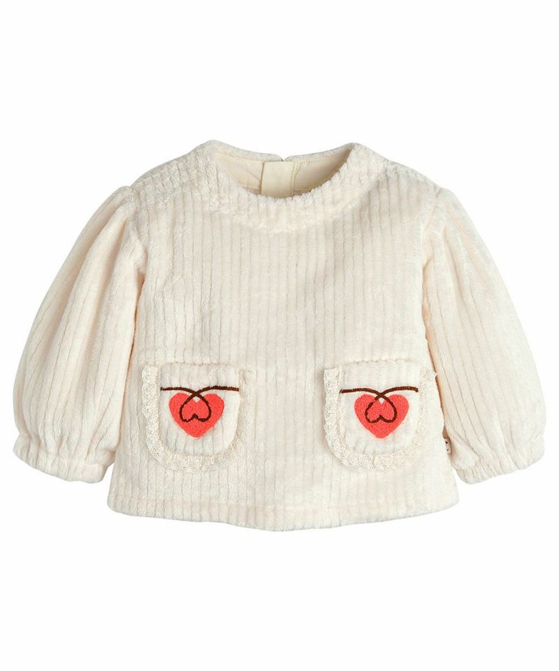 保温性に優れたソフトなフリース素材の花柄セットアップ。トップスのポケットのハート刺繍とレースがラブリーな印象を与え、通園コーデにも使えるアイテムです。