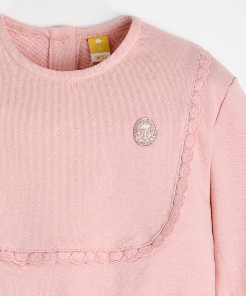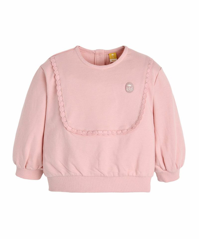 首元から胸元にかけて施されたフリルがポイントのセットアップ。トップスに大きくデザインされたフリルは、シンプルながらも女の子らしいかわいいアイテムです。