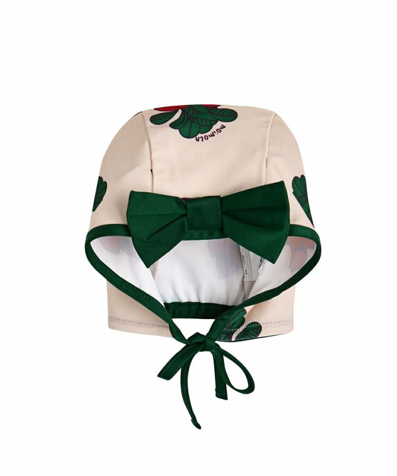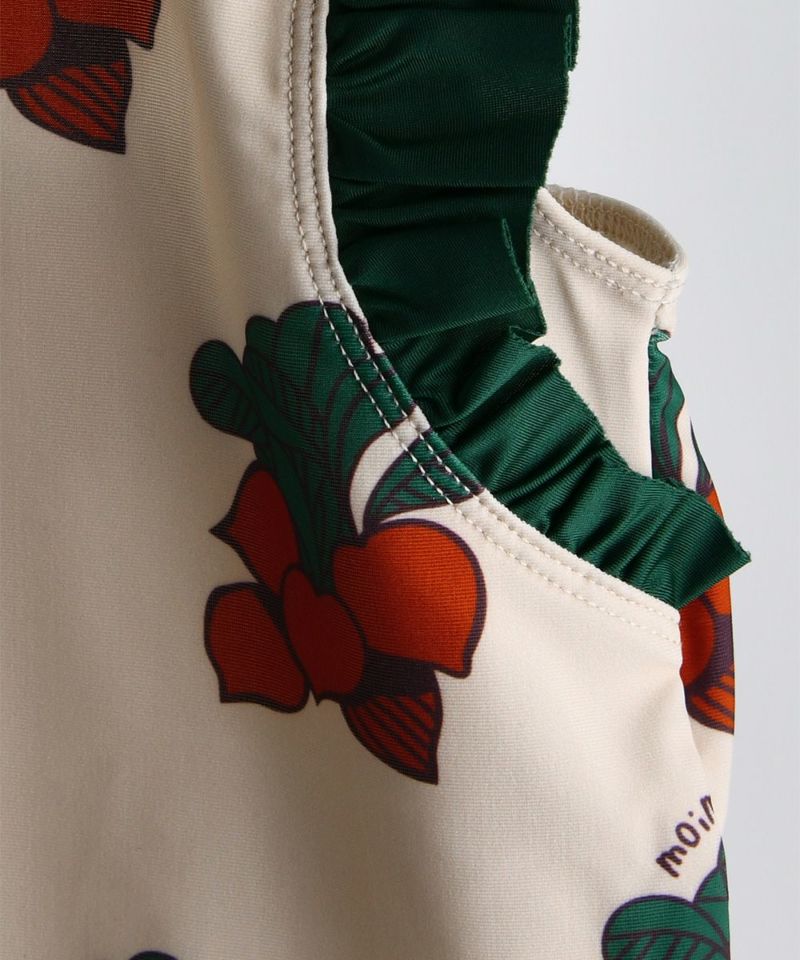 カブ柄のワンピース水着。肩の配色フリルと、ビッグリボン付き帽子がポイント。ラディッシュラッシュガード(W248SMI12P)との兄妹ルックがおすすめです。