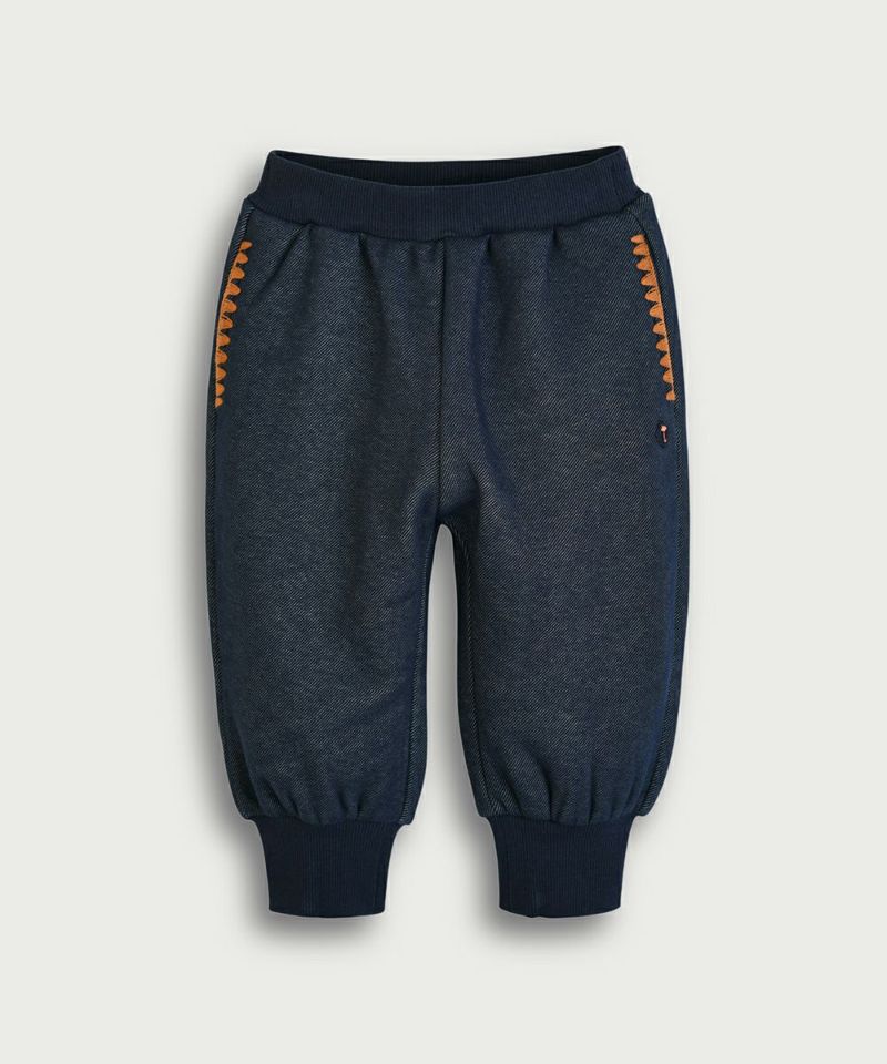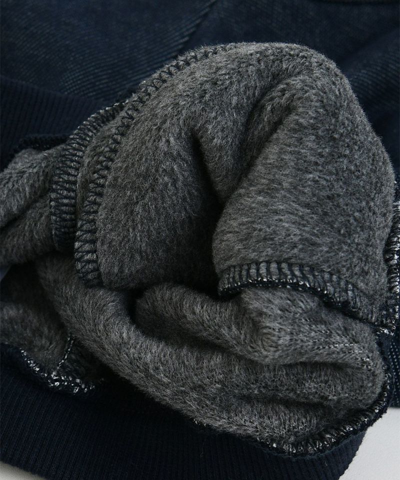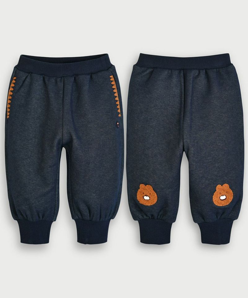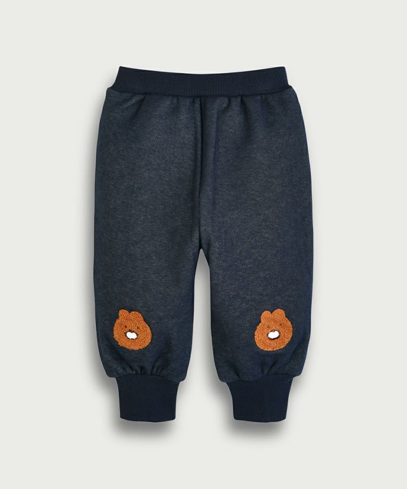 普段着に大活躍するデニムライクな起毛ジョガーパンツ。両ポケットにはキャメルカラーのメロ刺繍とさりげなくブランドマークの刺繍、うしろの裾には可愛らしいクマのデリック(derick)の刺繍がワンポイントで付いています。柔らかくて暖かい起毛裏地で真冬まであたたかく着用できるアイテムです。