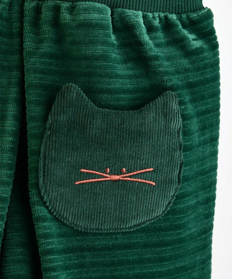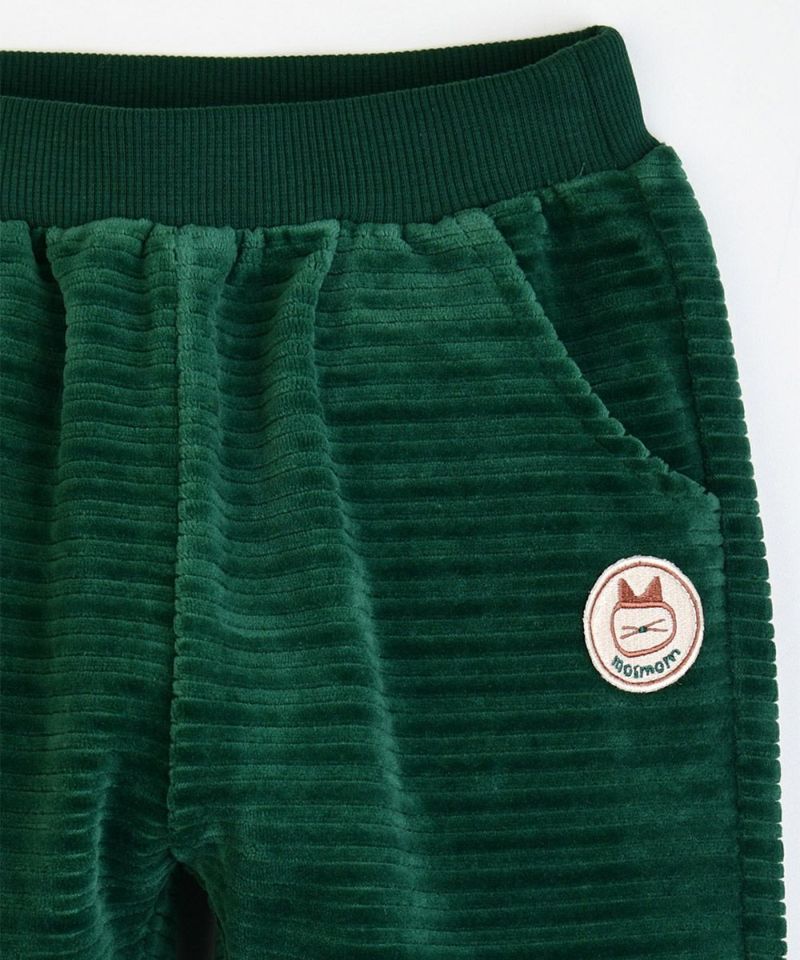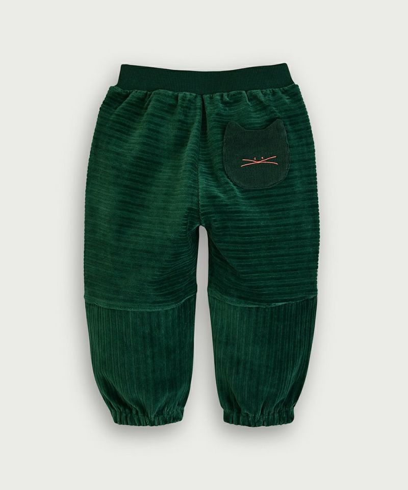 可愛いポイントがいっぱいのゴルベロア(ベロアとコーデュロイのMIX)ジョガーパンツ。膝あたりでの切替や、フロントのワッペンはネコのミャオ(meow)、ヒップのポケットはネコ型になっていてCute。スタイリッシュな冬のデイリーパンツとしておすすめです。
