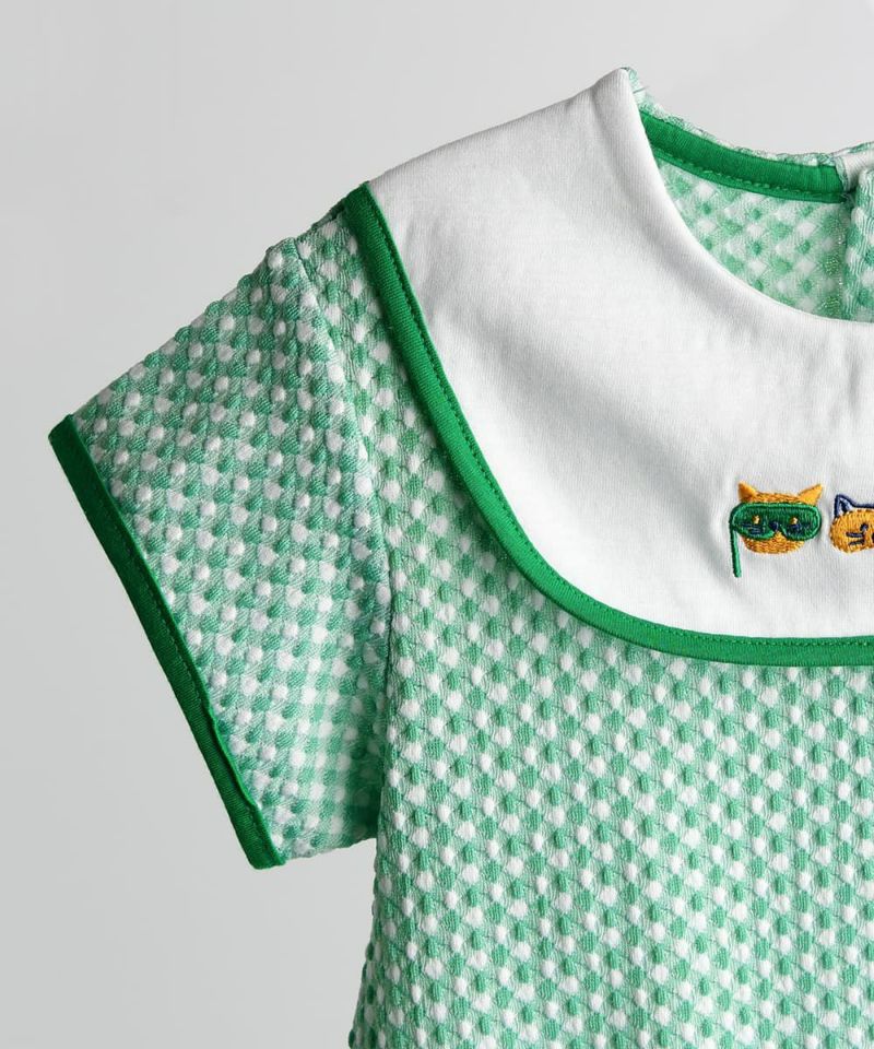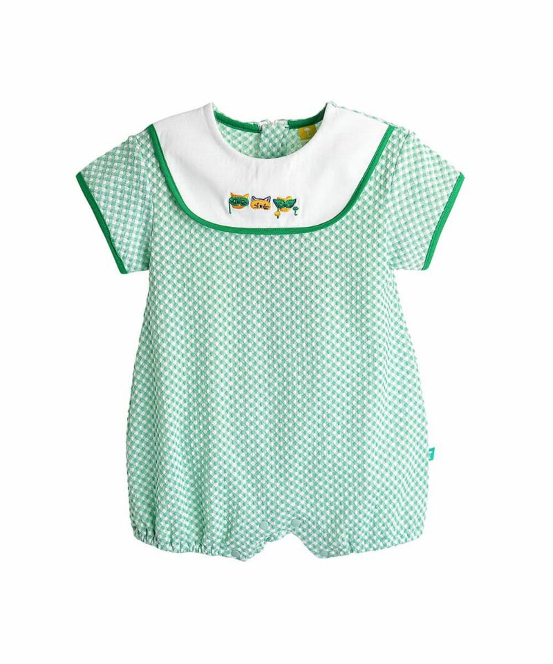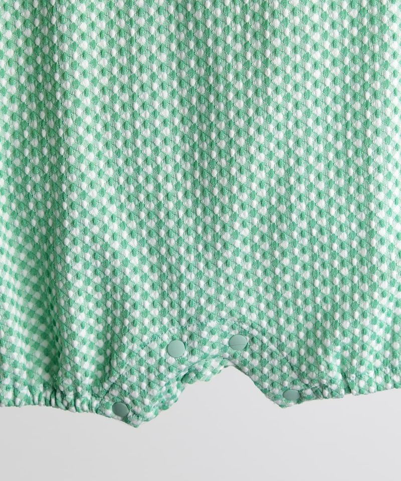 ジャカード素材にスタイがついた4分丈カバーオール。夏に快適なサラッとした素材で着心地のいいアイテムです。