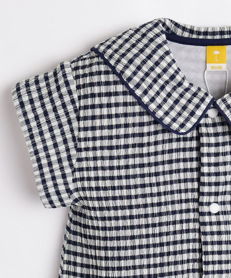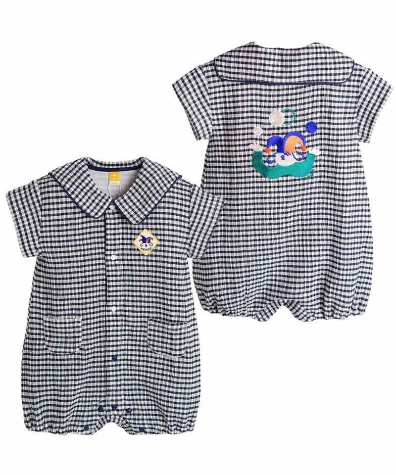 涼しい生地感のチェックの柄が3分丈カバーオール。夏に快適に過ごせる素材感で、襟付きなのでおしゃれに着用いただけます。バックのピエロの刺繍もポイントです。