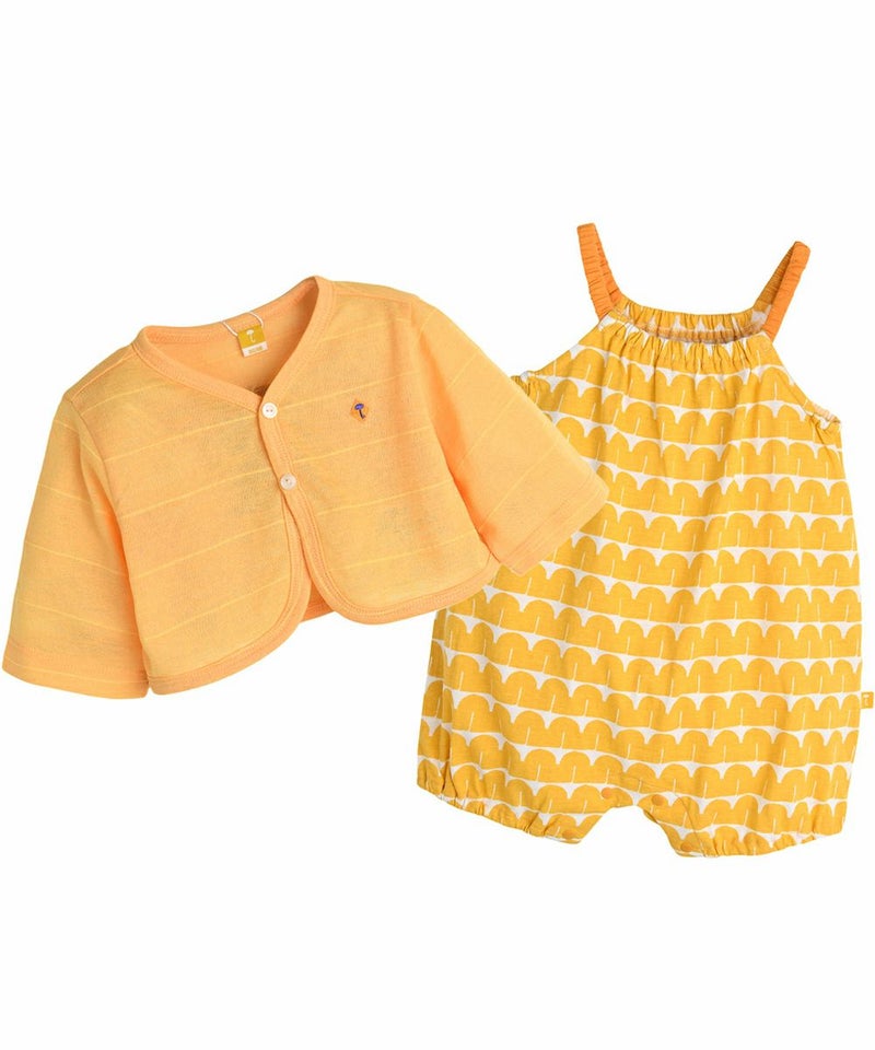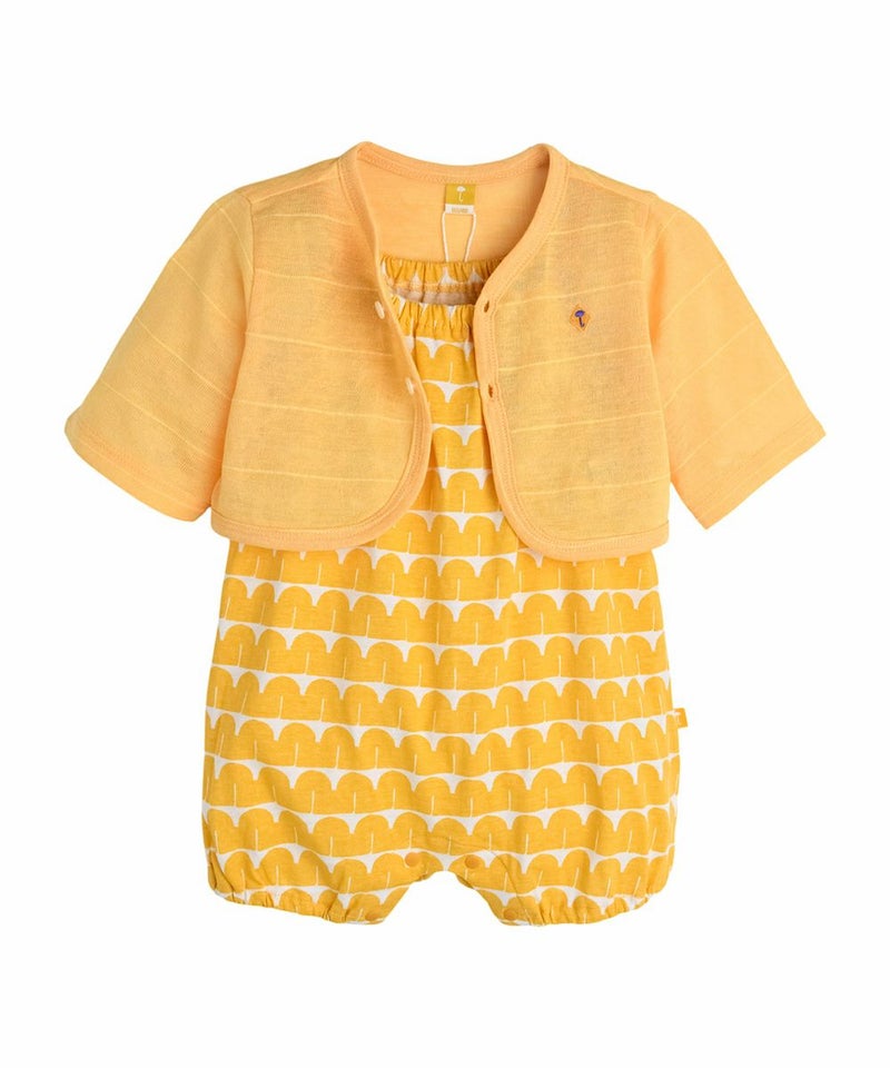 カバーオールとカーディガンの2点セット。夏に映えるイエローカラーがポイント♪カーディガンはほかのコーディネートにも着回しができます。