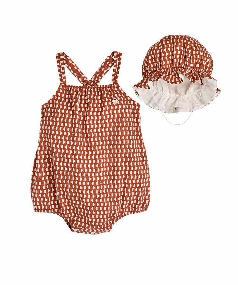 レトロ感のある幾何学柄カバーオールと帽子のセットアイテム。ふわりとした帽子が可愛いらしい印象に♪ベビーギフトとしても喜ばれるアイテムです。
