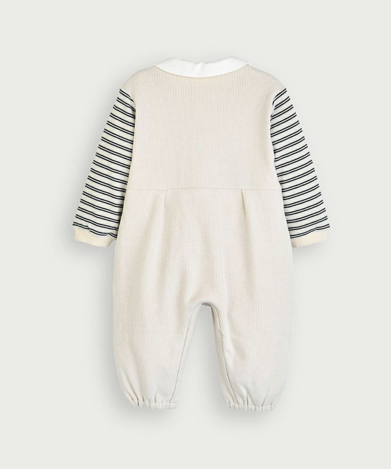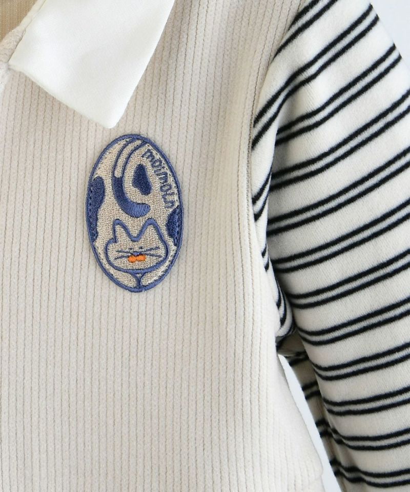柔らかい起毛ジャカードの長袖カバーオール。ボーダー柄の袖との切替が重ね着風なのと、胸元のネコのミャオ(meow)刺繍や首元のスナップボタンをあえてブルーに統一したりとおしゃれ感漂うデザイン。パンツ部分はゆったりフィットなシルエットで、フロントから足先までスナップボタンで、脱ぎ着もスムーズです。