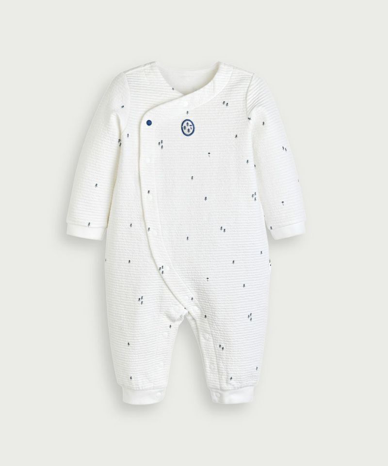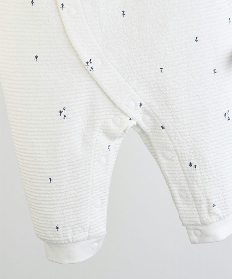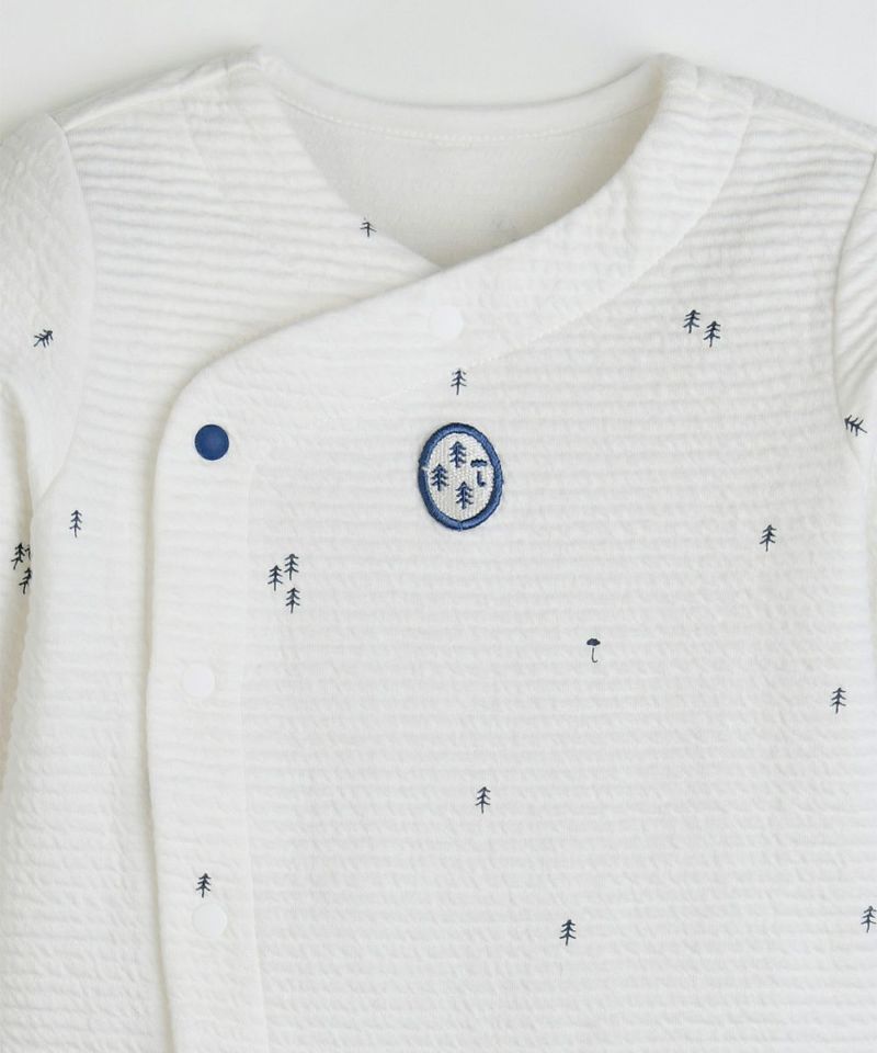 ストレッチの効いたダブルフェイス生地を使用し、繊細な表面縫製で赤ちゃんの肌をより柔らかく包み込んでくれる長袖カバーオールと帽子のセット。胸元のワッペンポイントでひと味を加え、ブルーのパイピングと全体の木やブランドマークの総柄でアクセントを加えたデザイン。スナップボタンでお子さまの着替えも簡単にできます。コットン素材の商品は、着心地・肌へのやさしさ・快適性に優れた、毎日着たくなる安心素材です。お子さまののデイリーウェアとしてはもちろん、ギフトにも大変喜ばれるおすすめのセット商品です。