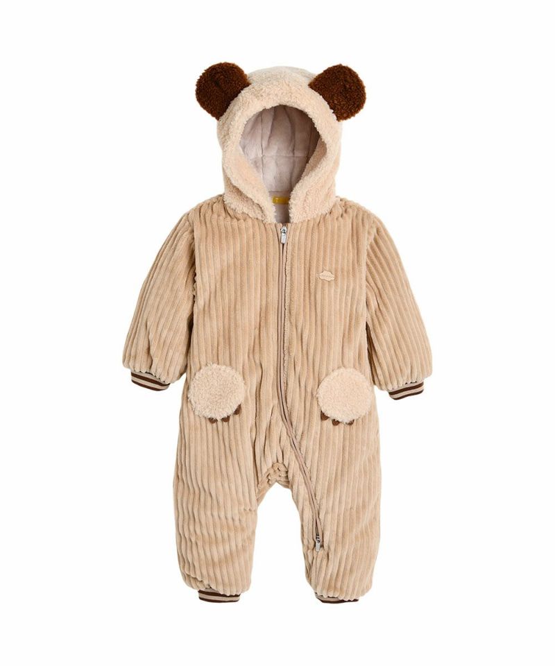 ふんわりとしたファーのリブ素材にボア裏地を使用し、保温性を高めたクマのカバーオール。大きなくま耳とおしり部分、フロントポケットにポイントを与えたアイテム。フロントポケットのコーデュロイ素材のくまの爪がこだわりポイントです。