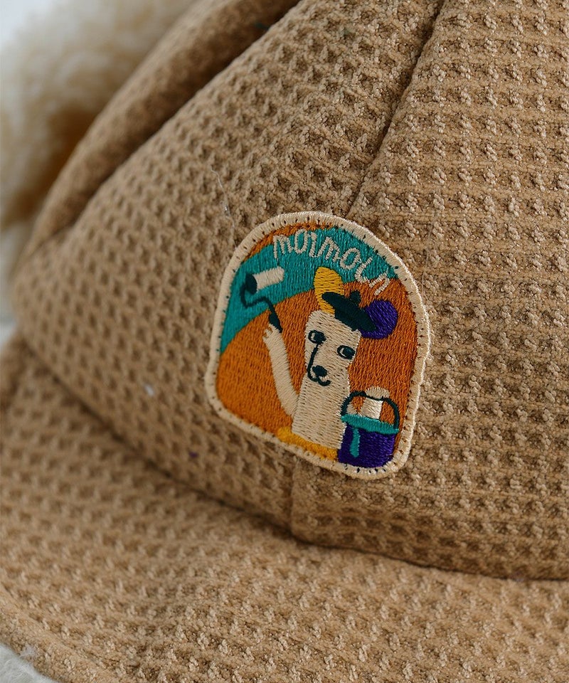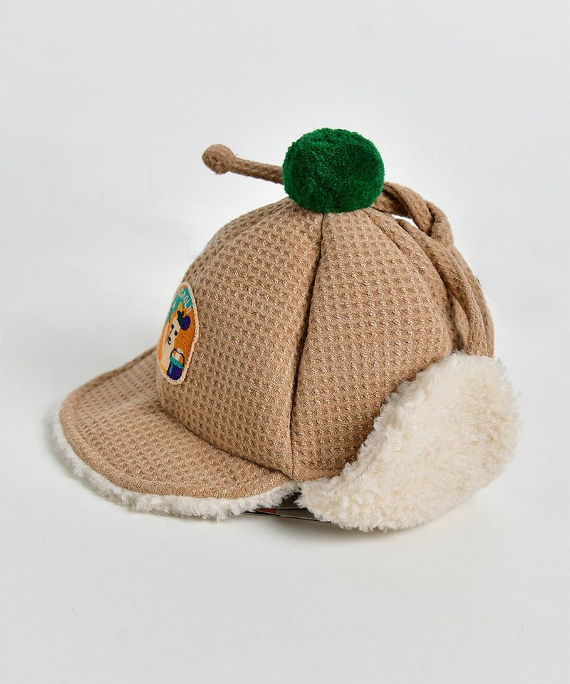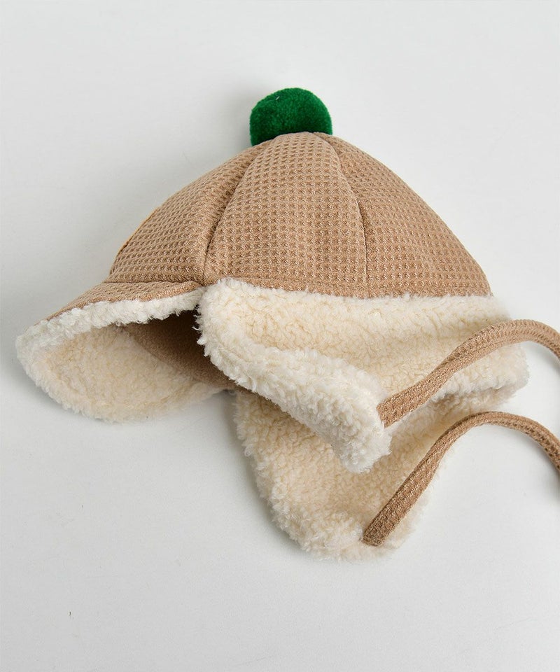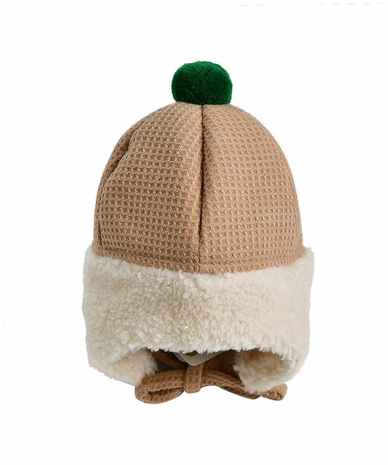 裏地のファー配色とグリーン配色のポンポンがポイントの防寒用耳あて付き帽子。ワッフルメロディー靴(W234SZI05P)とのコーデがおすすめです。