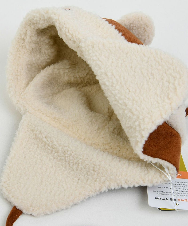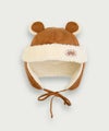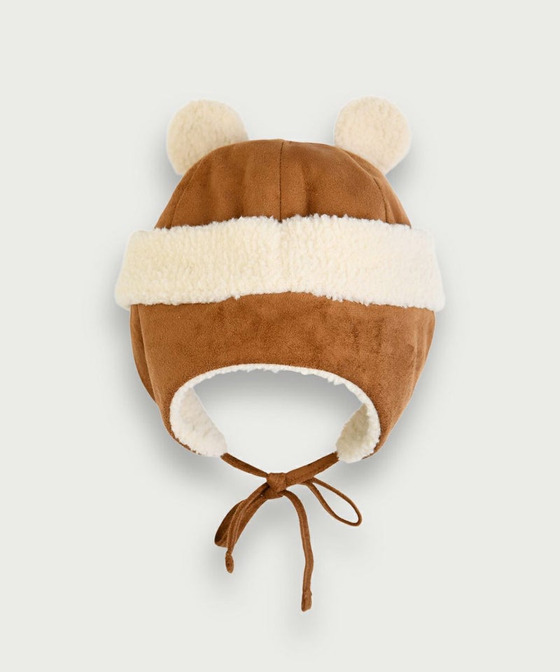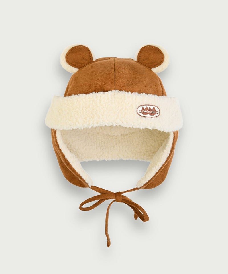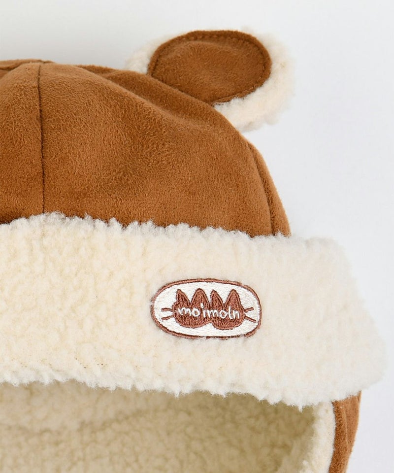スエードとボアの組み合わせの耳付きキャップ。耳と頬まで覆ってくれる耳覆いがあり、暖かく使える実用的なアイテム。クマのデリック(derick)の耳がとってもCuteでさりげない刺繍ワッペンにはネコのミャオ(meow)をプラス。紐付きなので落下防止にもなりお子さまにぴったりです。