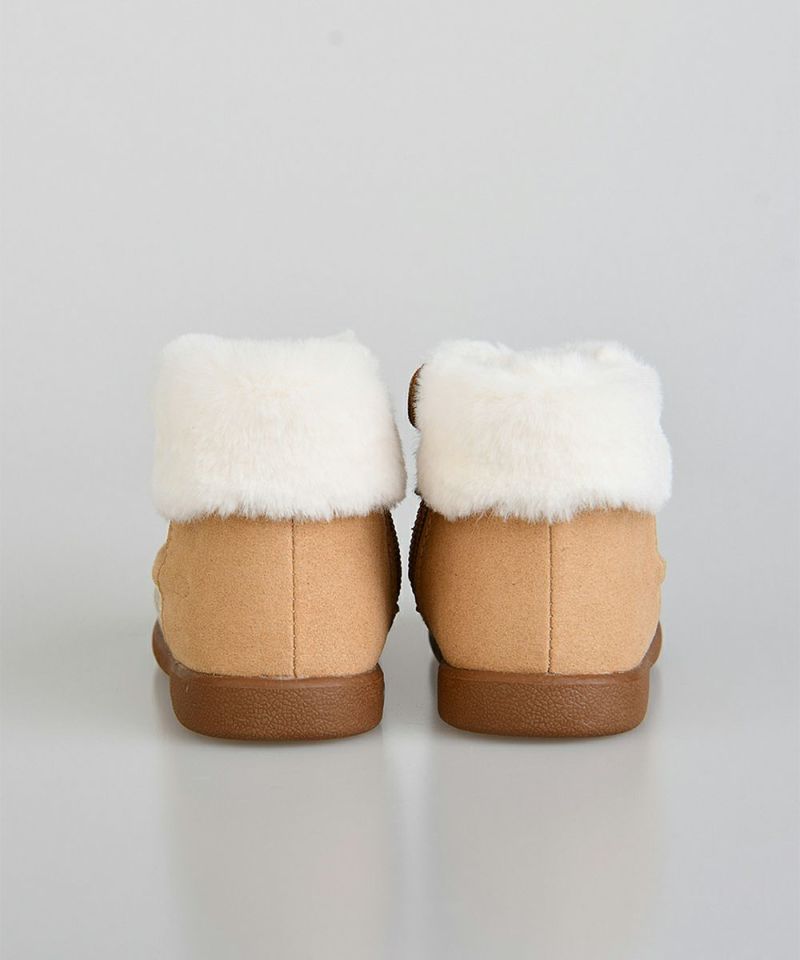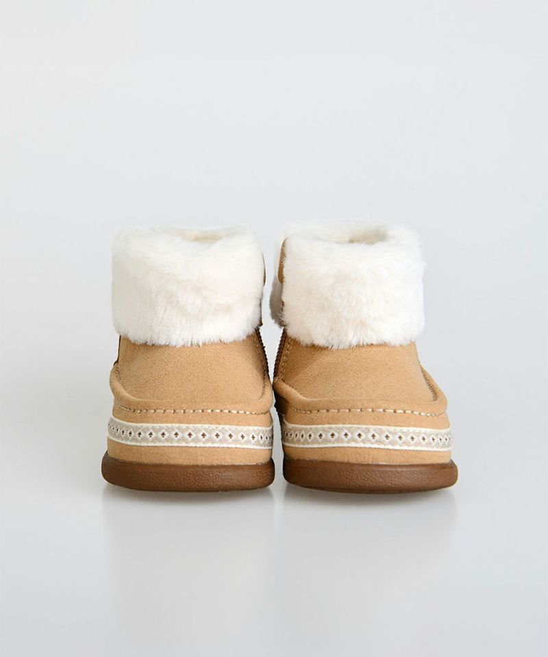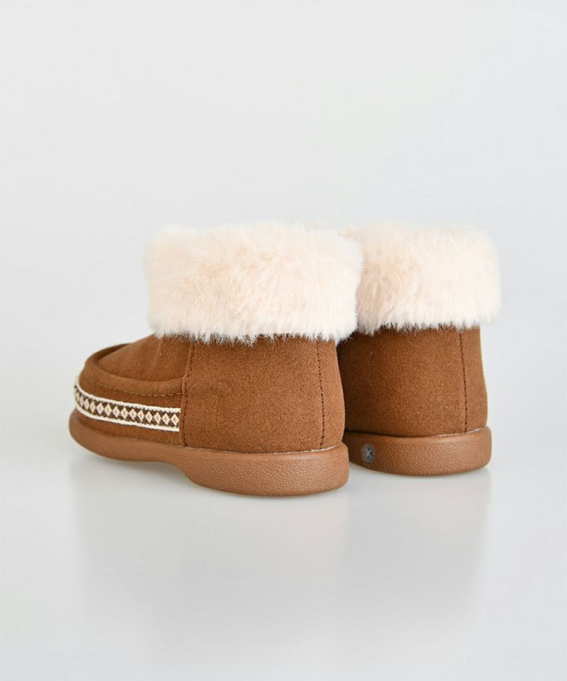 暖かいスエード素材のムートンブーツ型のメロディシューズ。足首にはファー、前から再度に向けてチロリアンテープでのアクセントがポイント。さりげなくブランドマークの押し印入り。ブーツの内側には、ベルボアの裏地とライレックスのインソールで保温性にもこだわったアイテムです。