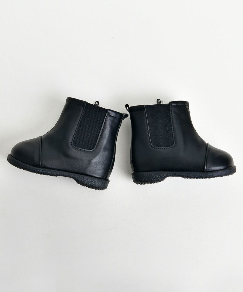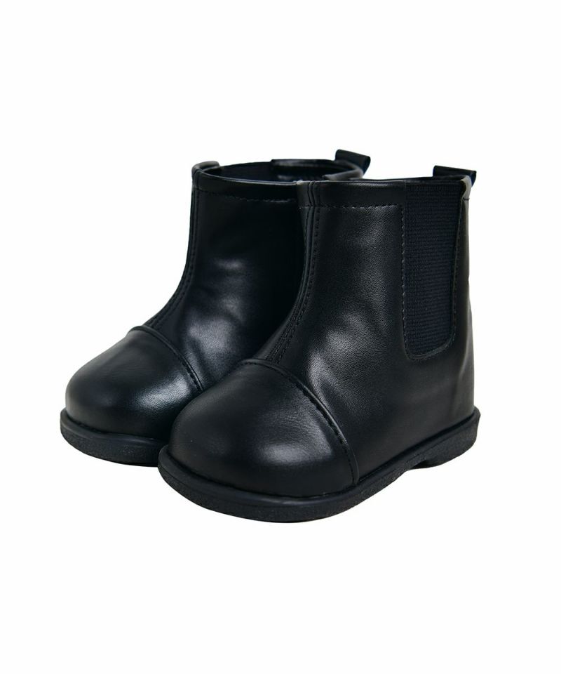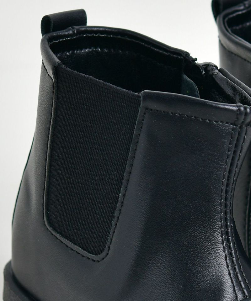 どんなコーデにも相性がいい、すっきりとした基本デザインのブラックチェルシーブーツ。後ろにシンボルマークが押されており、シンプルコーデのポイントになるアイテムです。