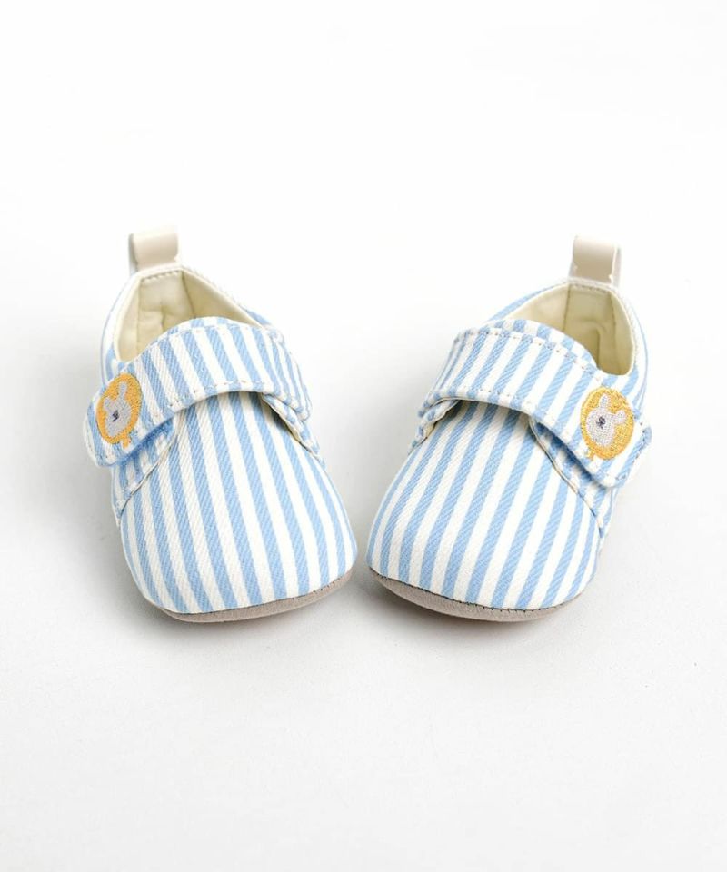 スカイブルーのストライプがさわやかなベビーシューズ。バルーンのベア刺繍がポイントです。