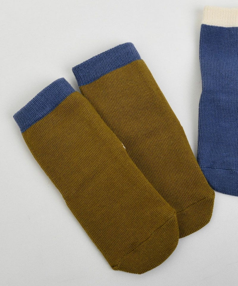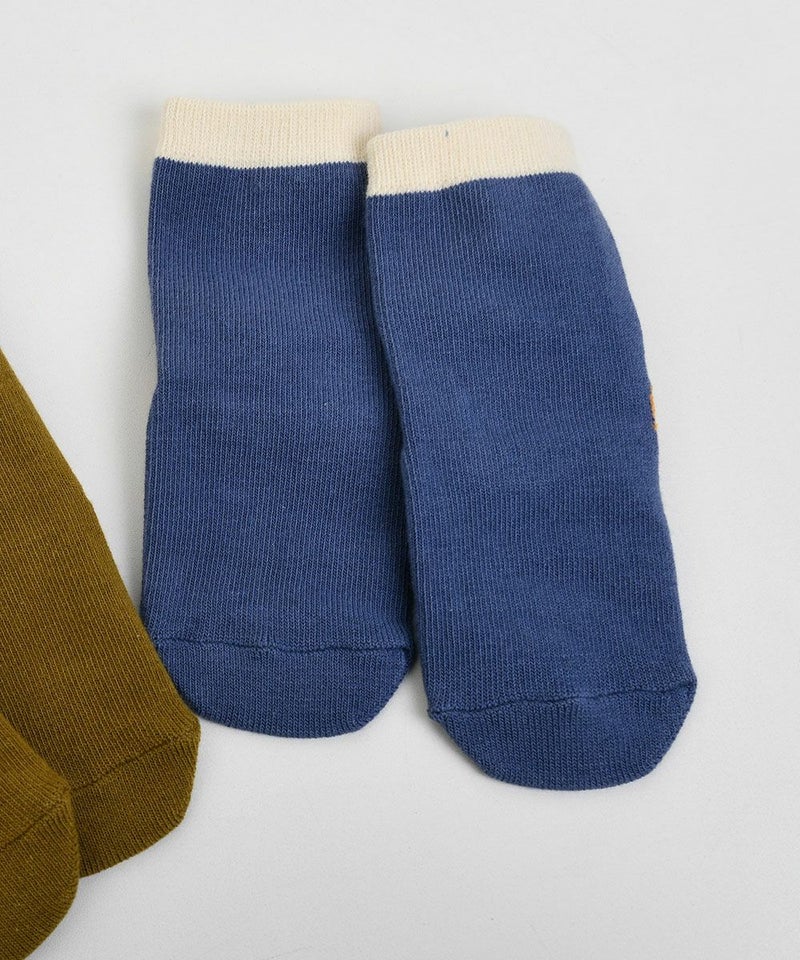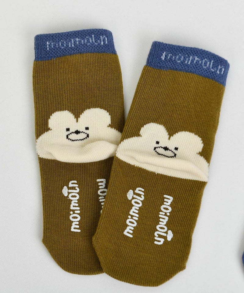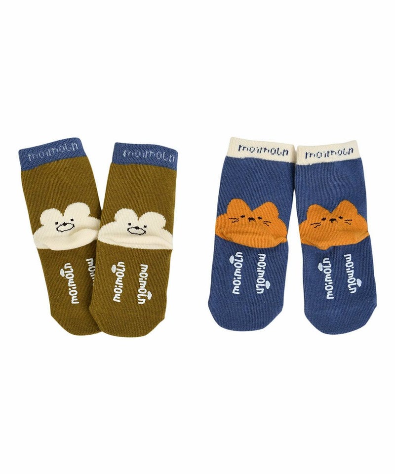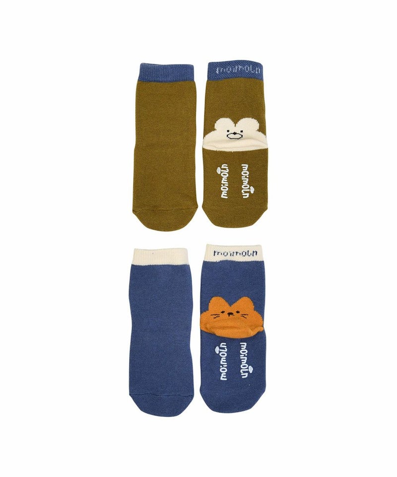 Cuteなアニマルの顔がかかと部分に隠れているミドル丈の靴下2足セット。口ゴム付近にはmoimolnロゴ、足の裏には滑り止めがついており、小さなお子様にぴったり。ネイビーは可愛いネコ、オリーブは可愛いクマの顔がかかと隠れており、歩くたびに可愛らしいポイントがちら見えするのがポイント。